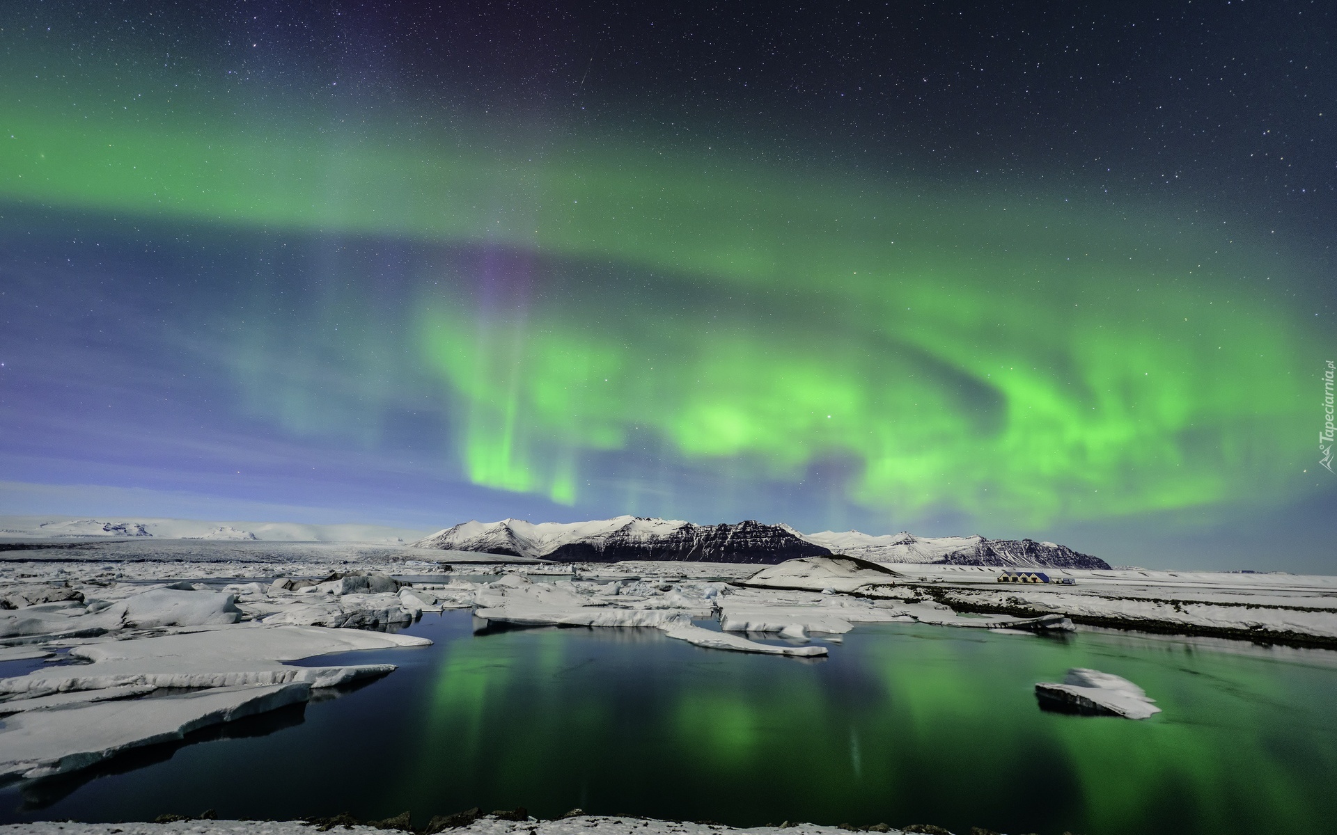 Edytor tapety: Zorza, Polarna, Góry, Rzeka