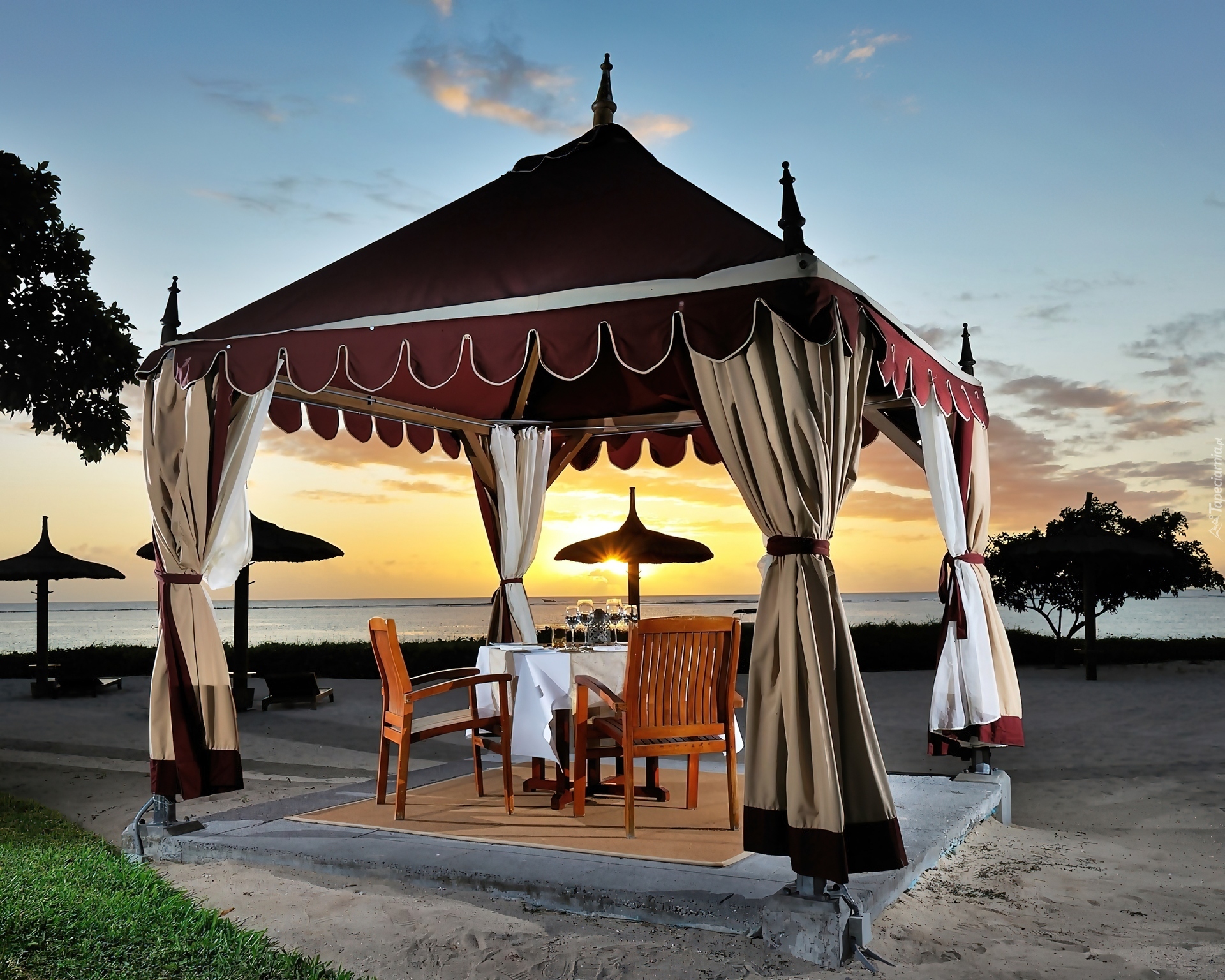 Edytor tapety: Tropiki, Zachód, Słońca, Morze, Plaża, Restauracja