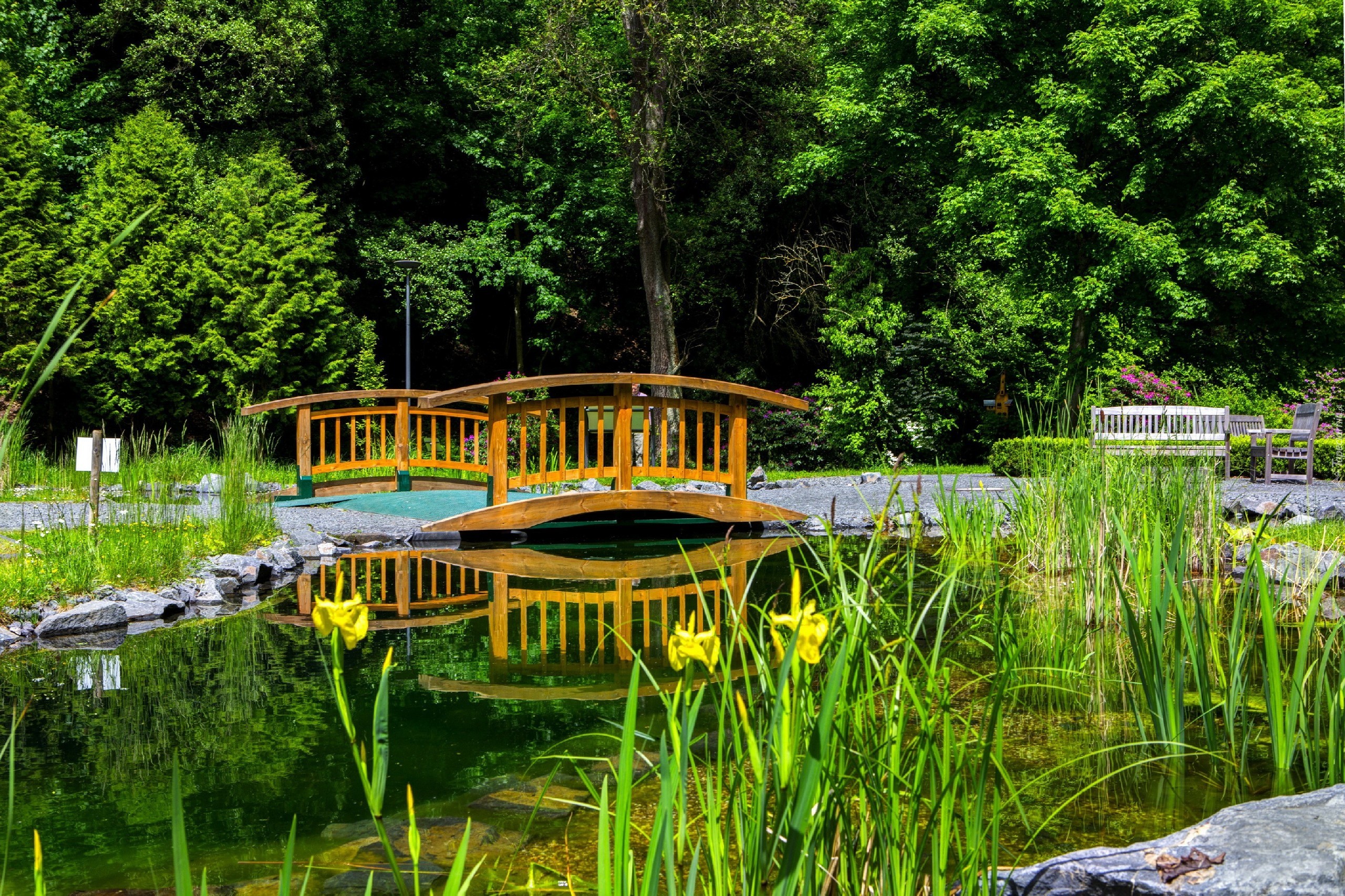 Edytor tapety: Park, Mostek, Rzeczka, Kwiaty, Trawy