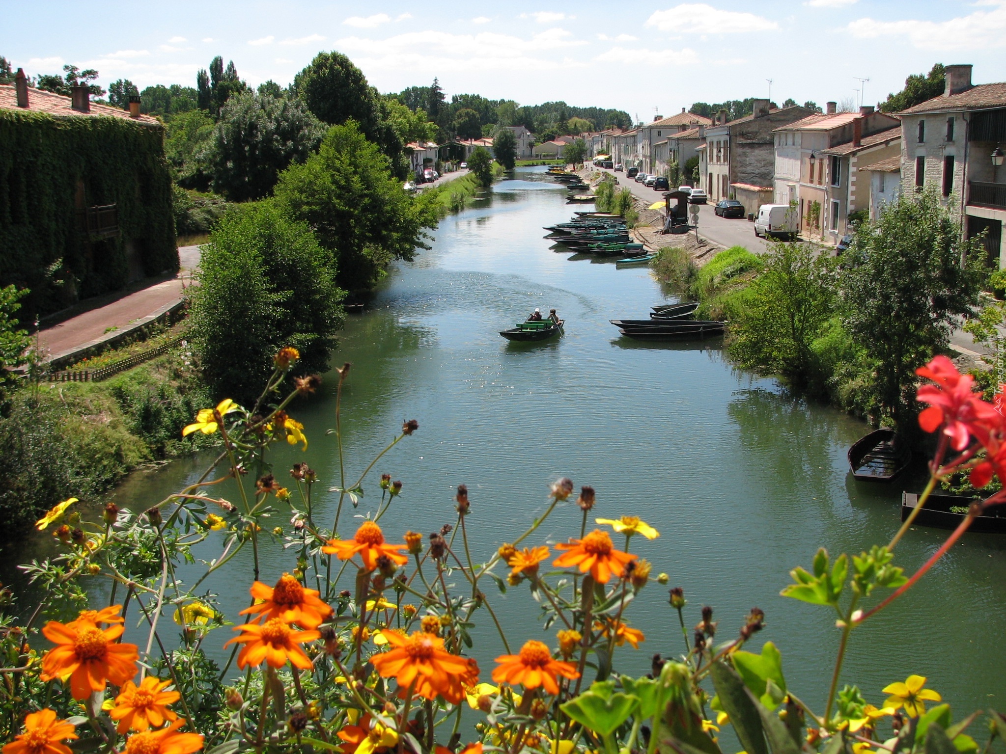 Edytor tapety: Rzeka, Domy, Kwiatki