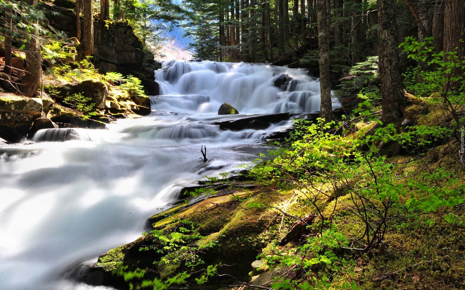 Edytor tapety: Las, Wodospad, Przebijające, Światło