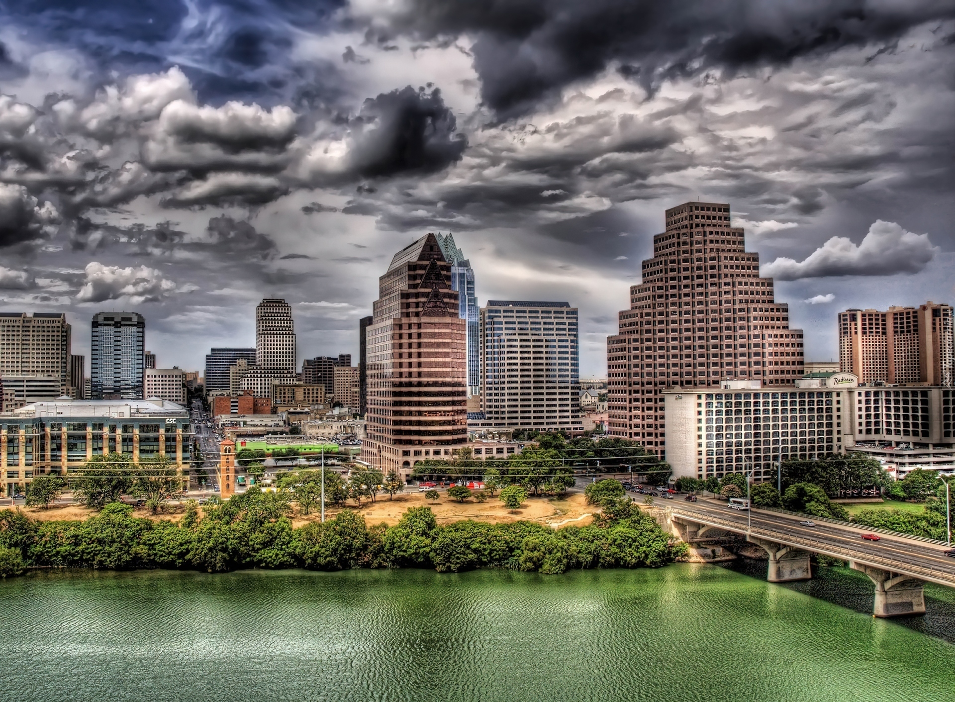 Edytor tapety: Rzeka, Most, Domy, Austin, Teksas