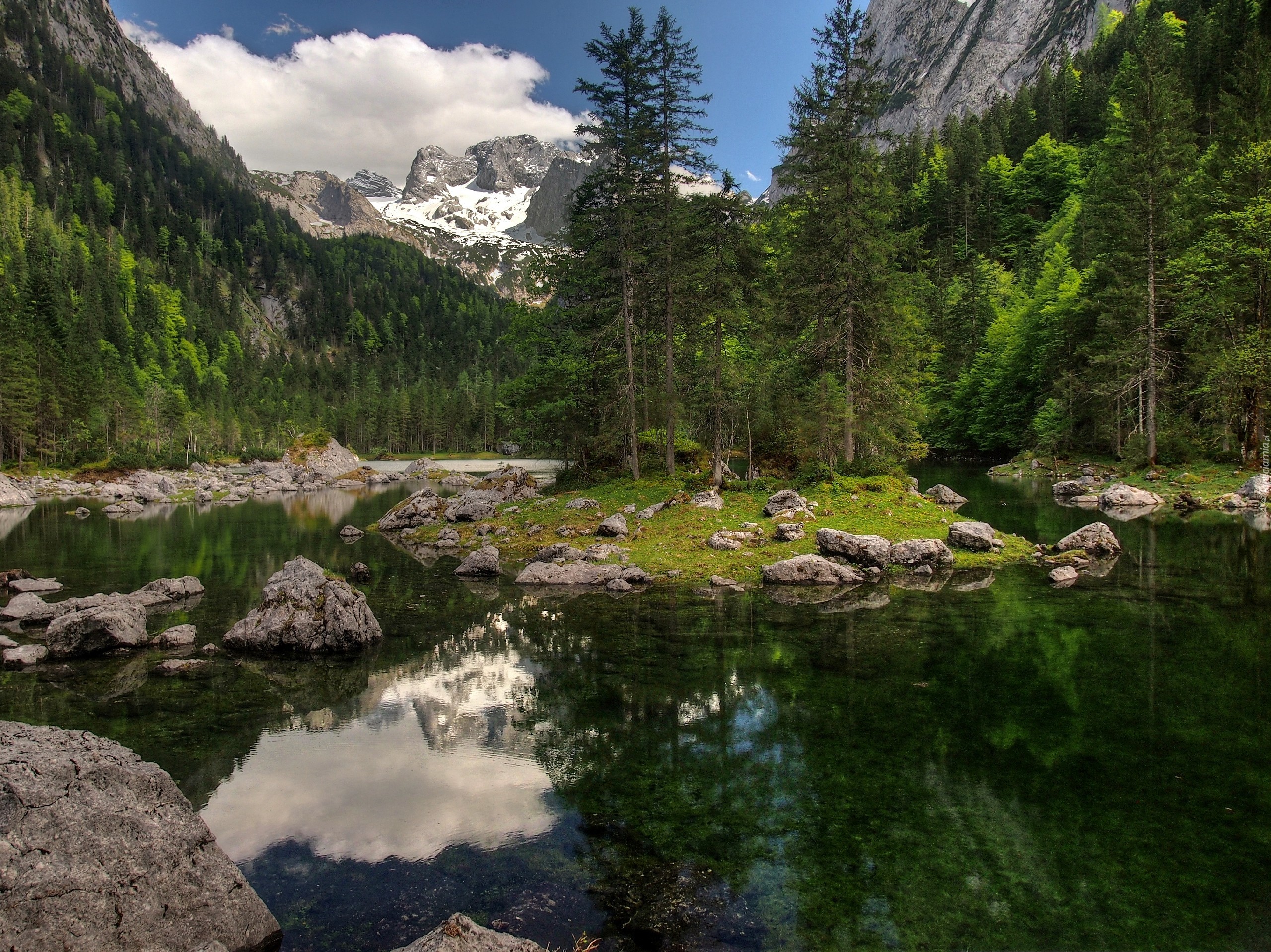 Edytor tapety: Góry, Jezioro, Drzewa, Wysepka, Kamienie