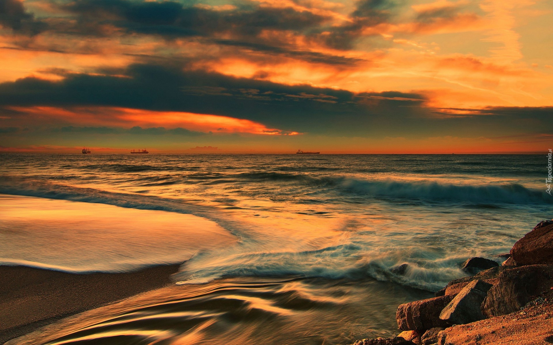 Edytor tapety: Morze, Fale, Skały, Statki, Zachód, Słońca