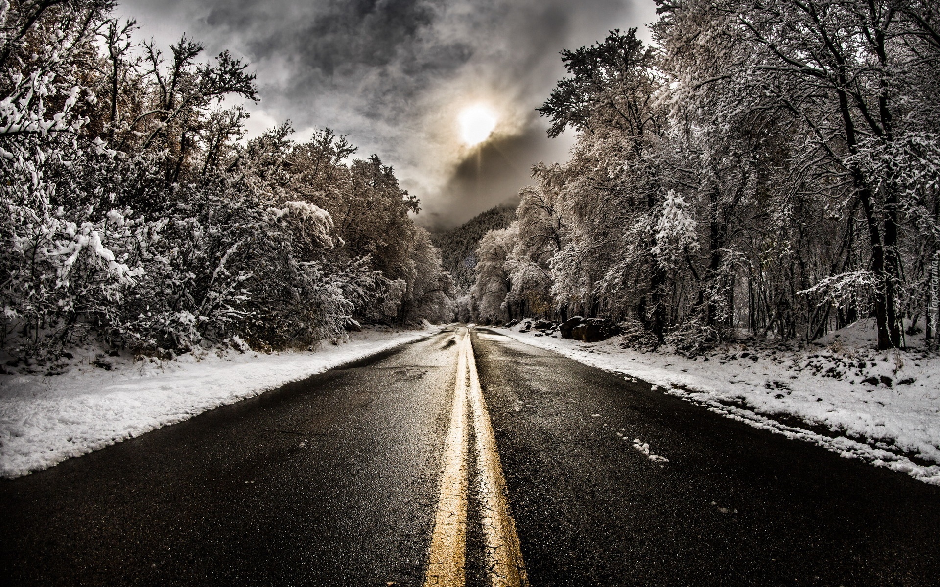 Edytor tapety: Droga, Drzewa, Śnieg, Słońce