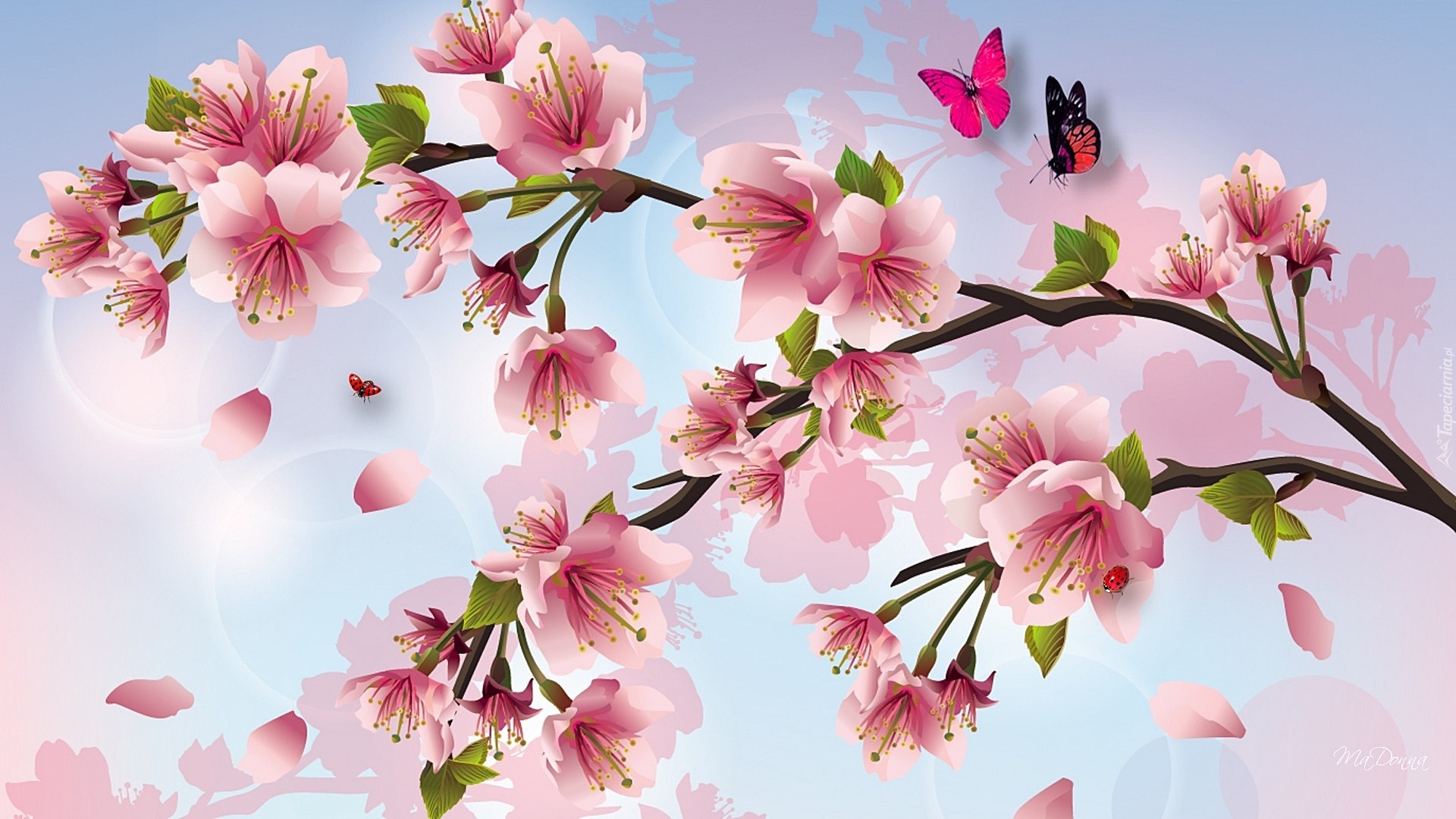 Edytor tapety: Kwiaty, Owocowego, Drzewa, Gałązka, Biedronki, Motyle