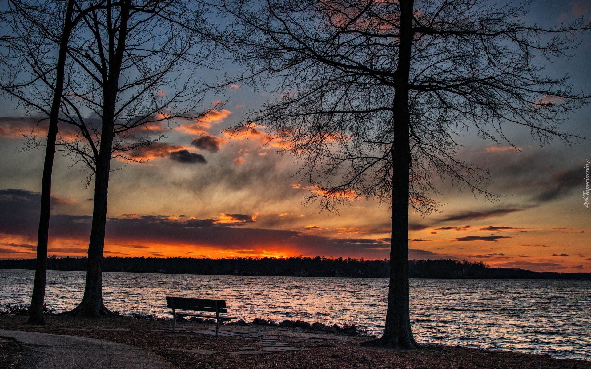 Edytor tapety: Rzeka, Drzewa, Ławka, Zachód, Słońca