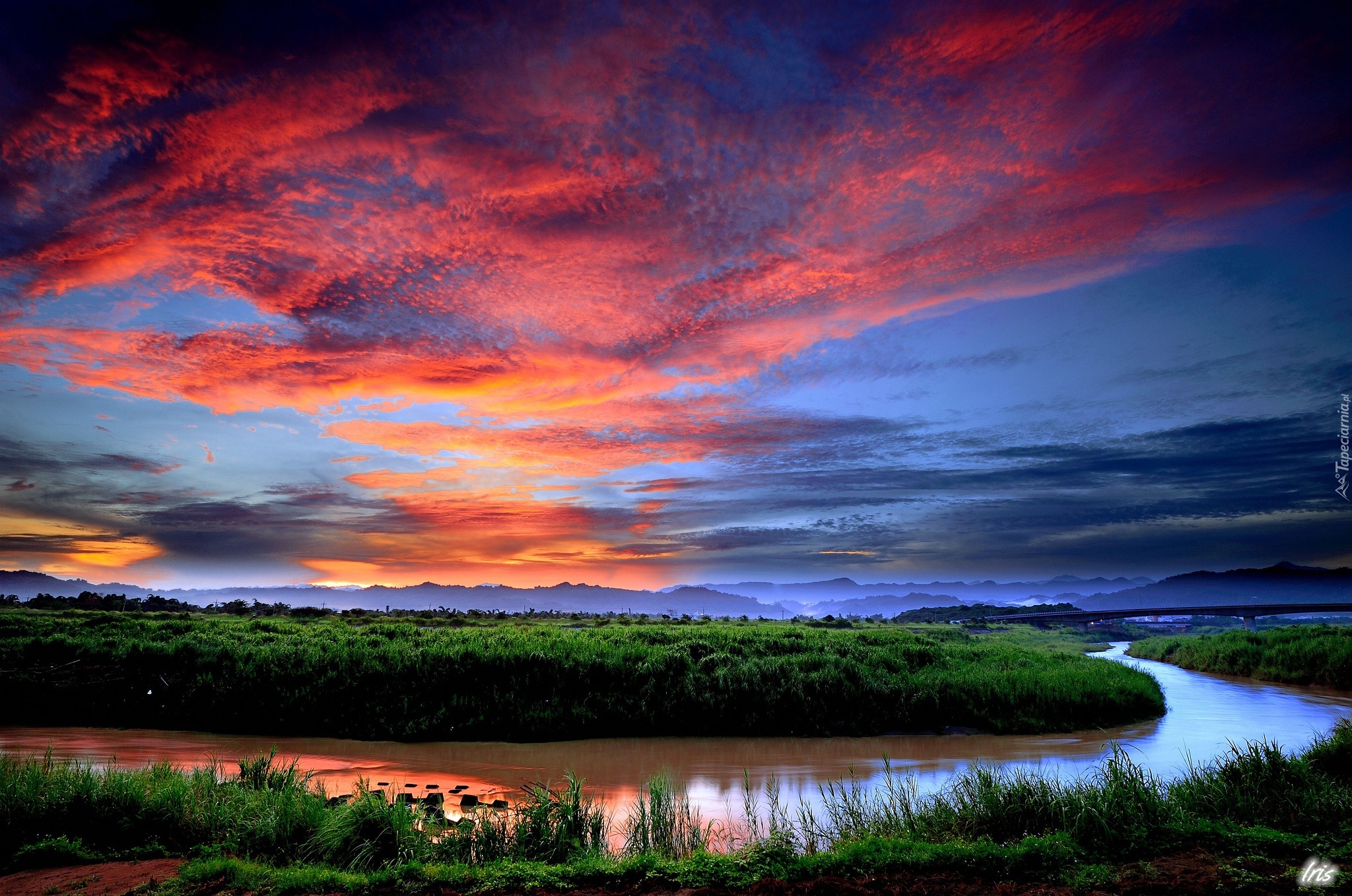 Edytor tapety: Zachód, Słońca, Rzeka, Rośliny