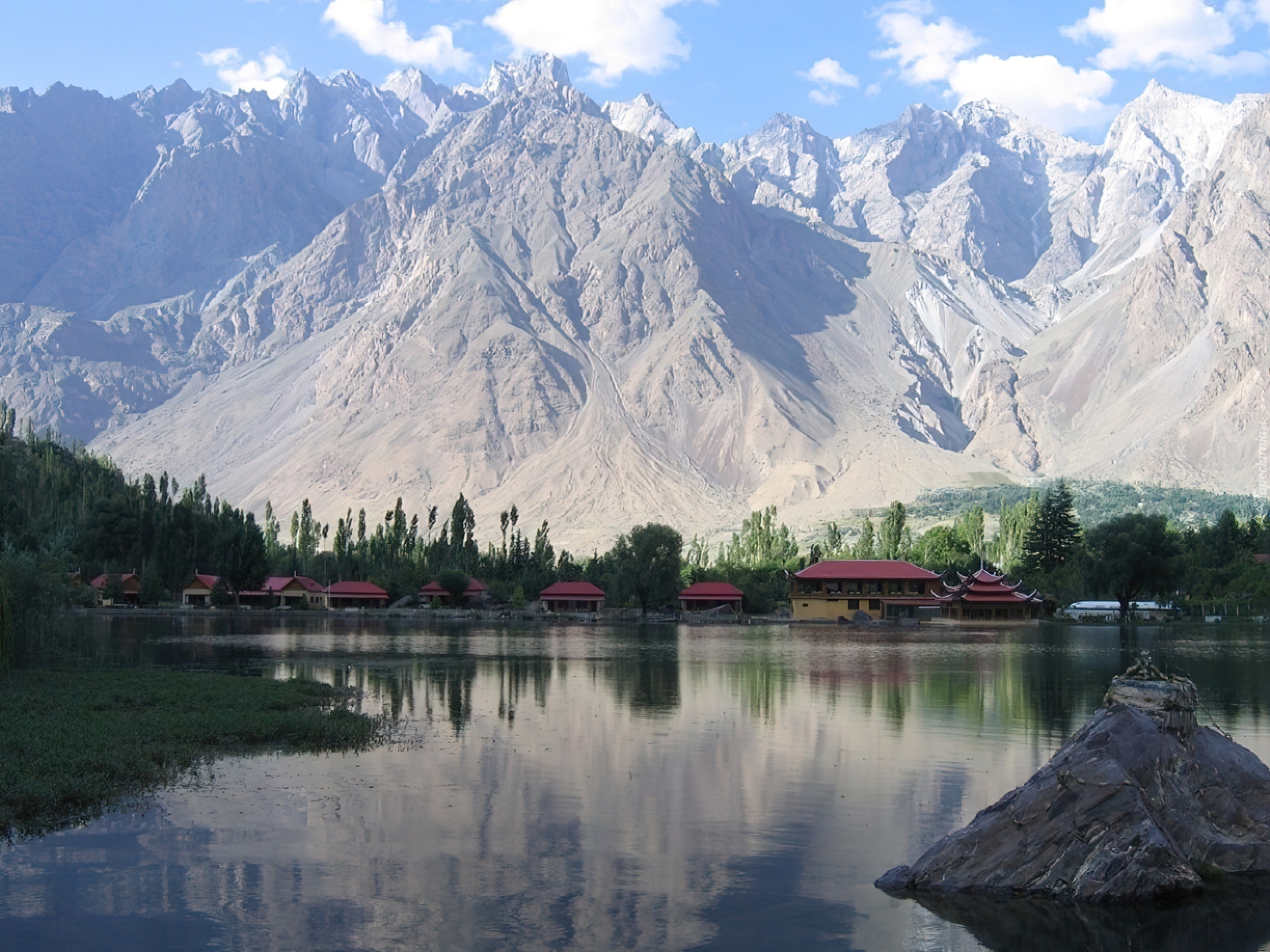 Edytor tapety: Góry,domki, Jezioro