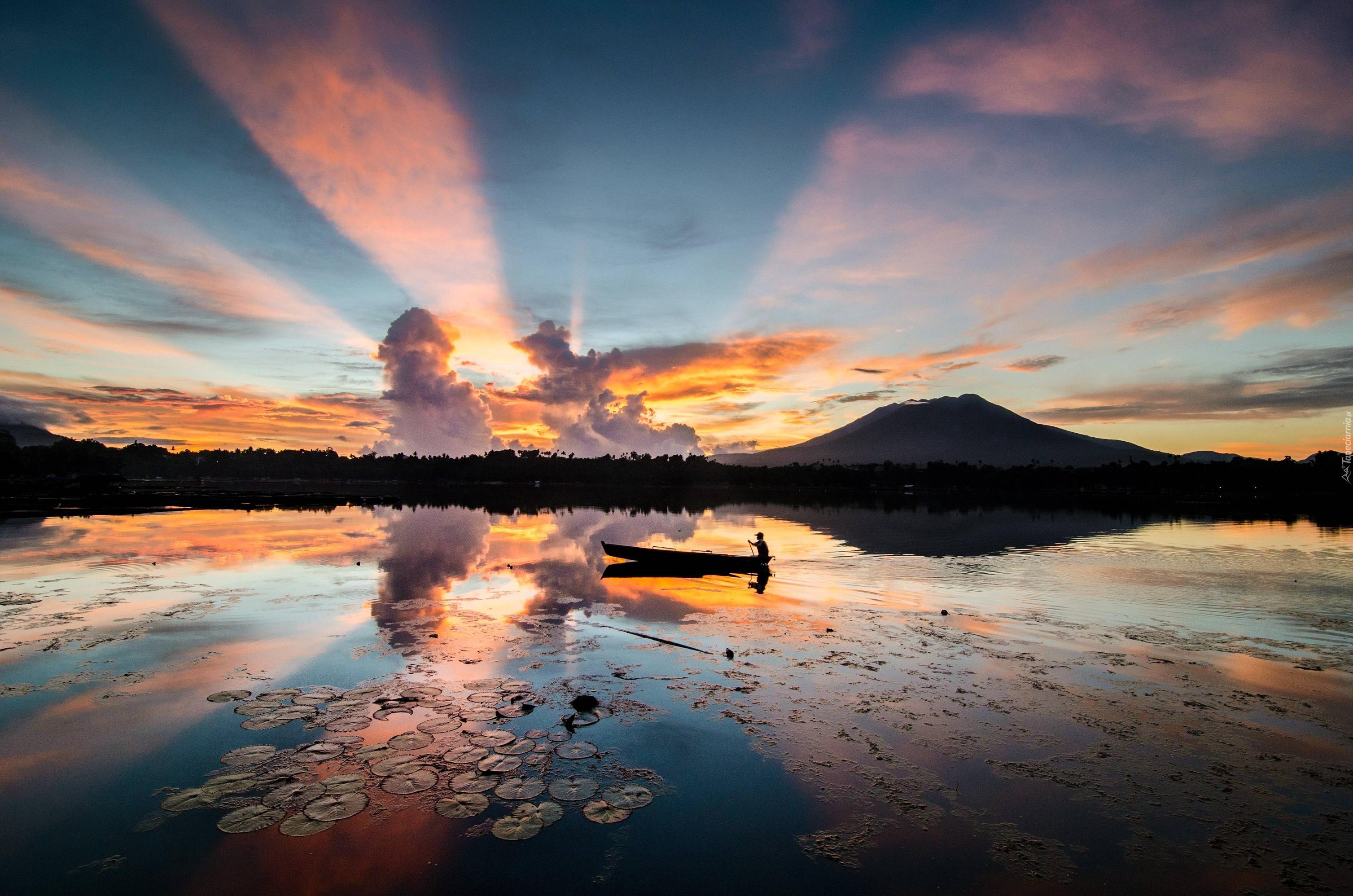 Edytor tapety: Promienie, Słońca, Chmury, Morze, Łódka