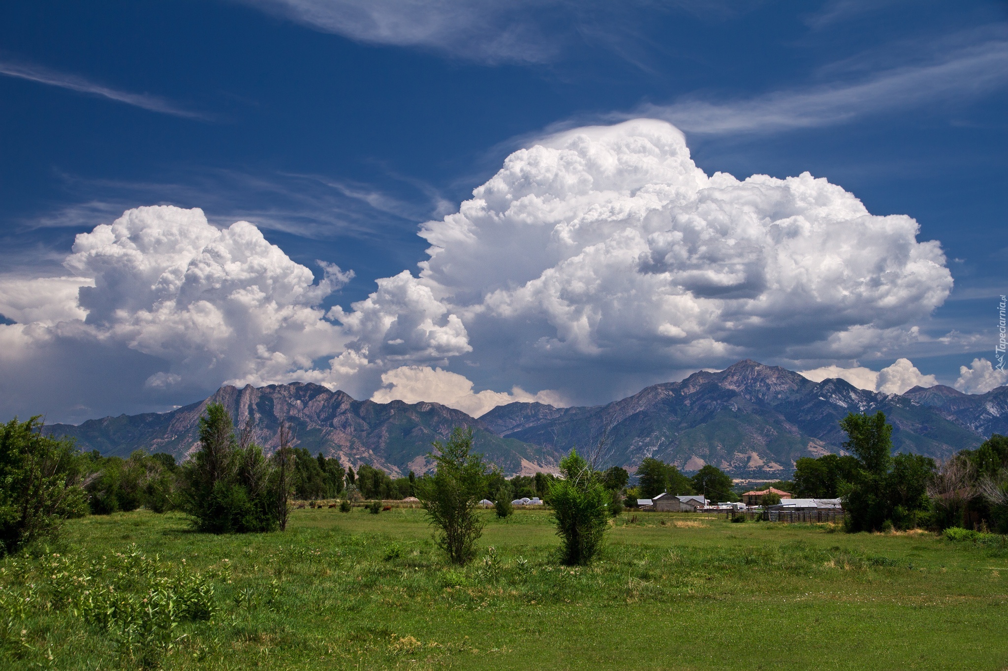 Edytor tapety: Góry, Chmury, Łąka, Drzewa