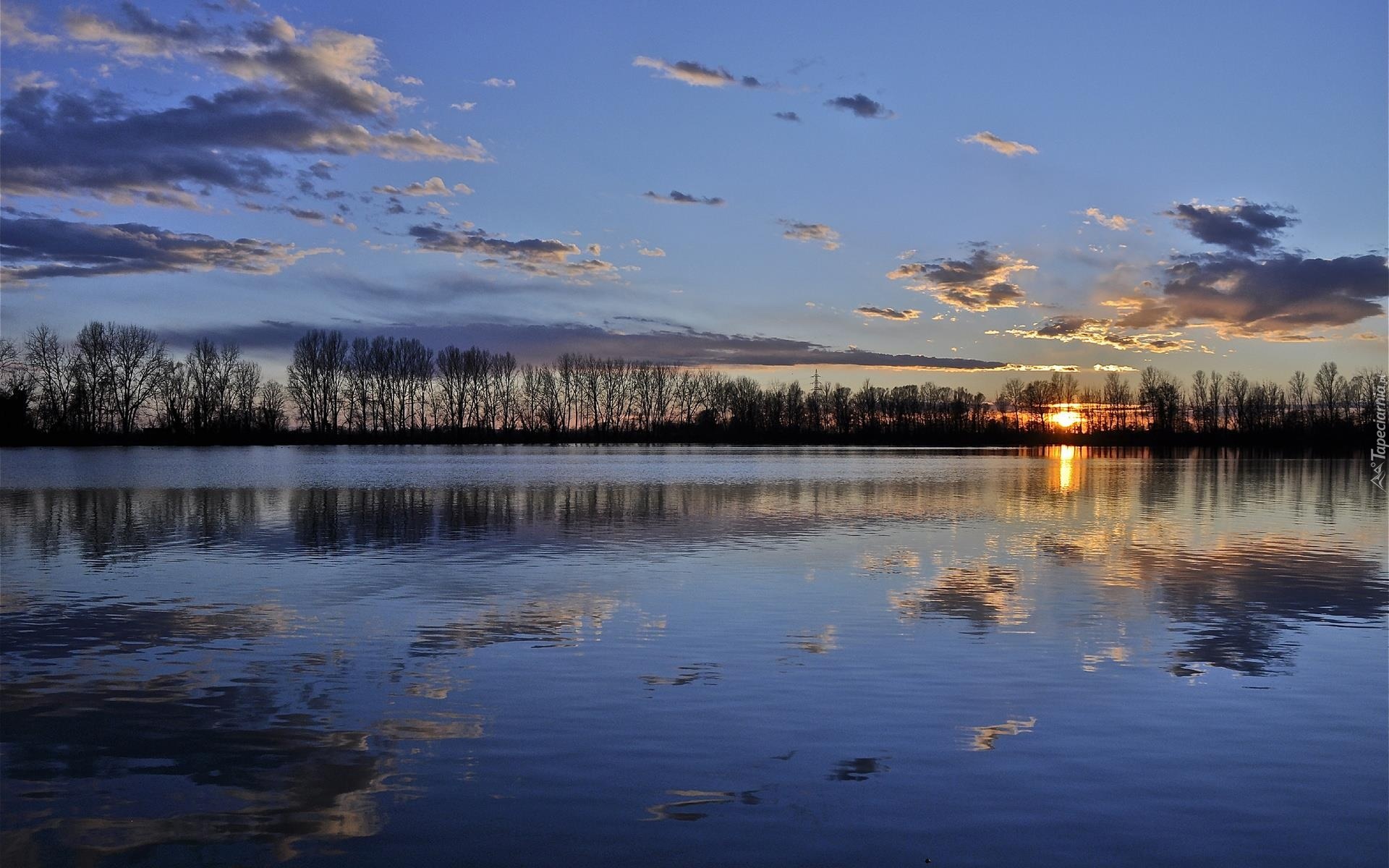Edytor tapety: Jezioro, Drzewa, Chmury, Zachód, Słońca
