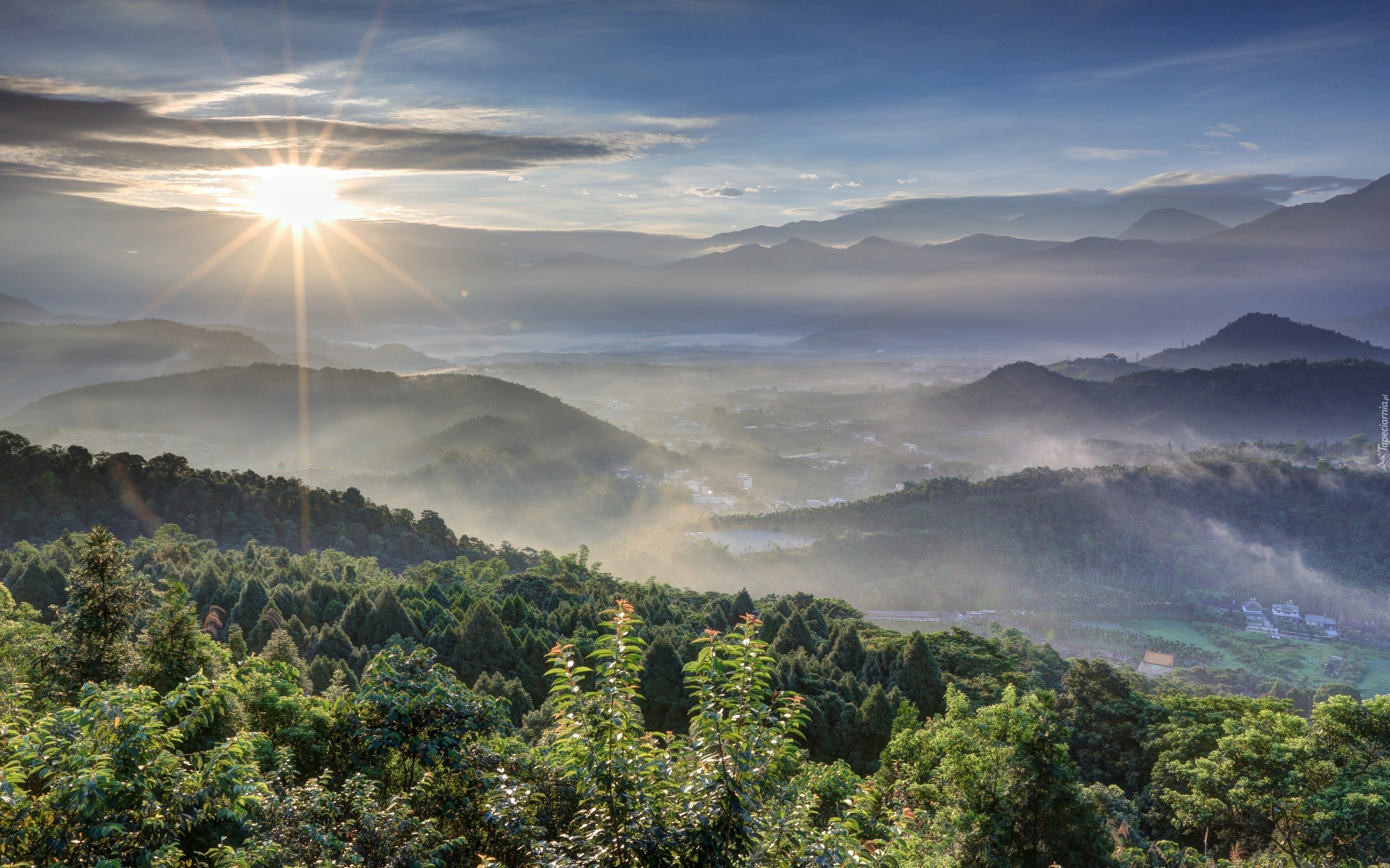 Edytor tapety: Promienie, Słońca, Góry, Las