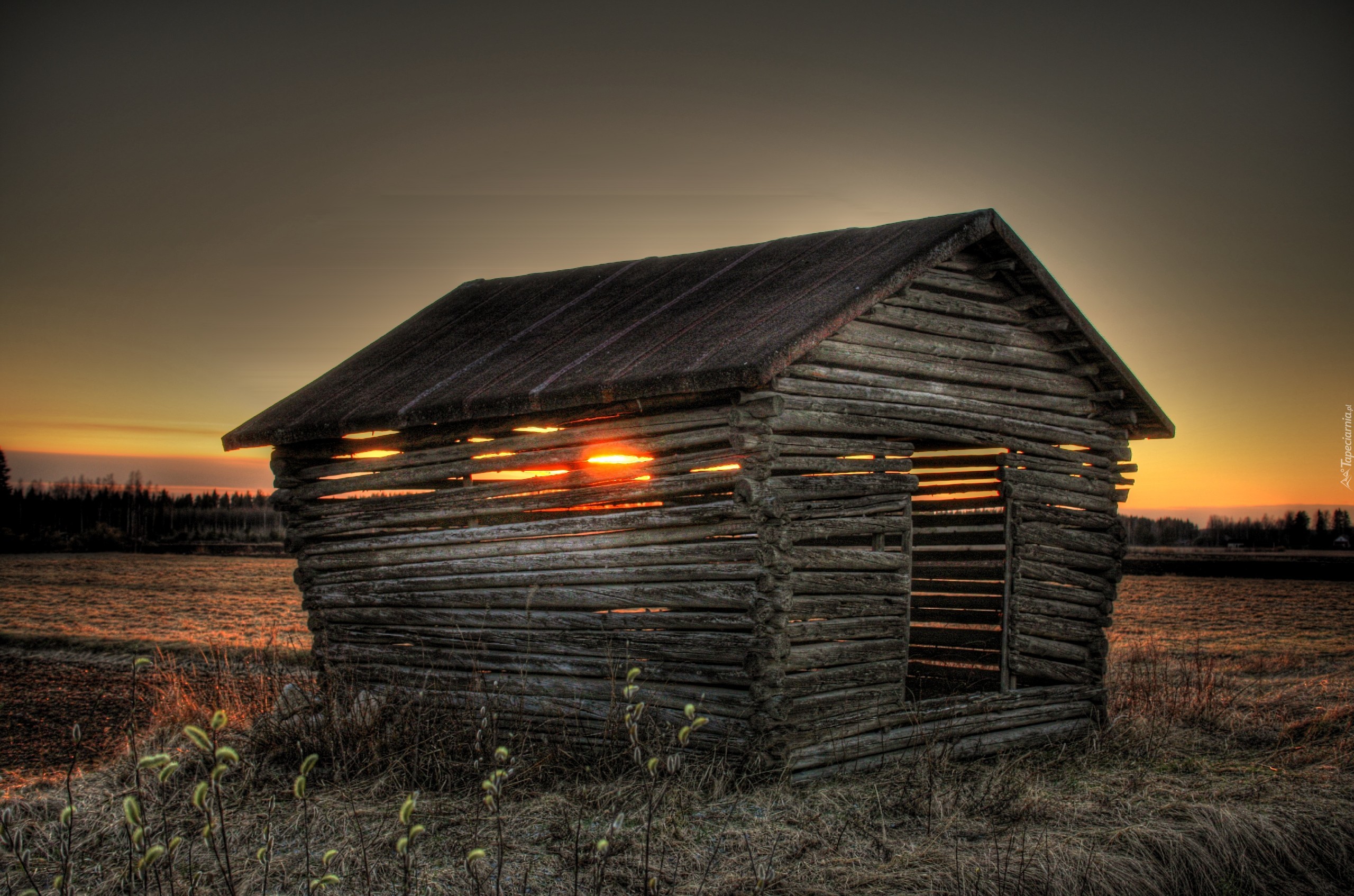 Edytor tapety: Domek, Zachód, Słońca, Pole, Budowla