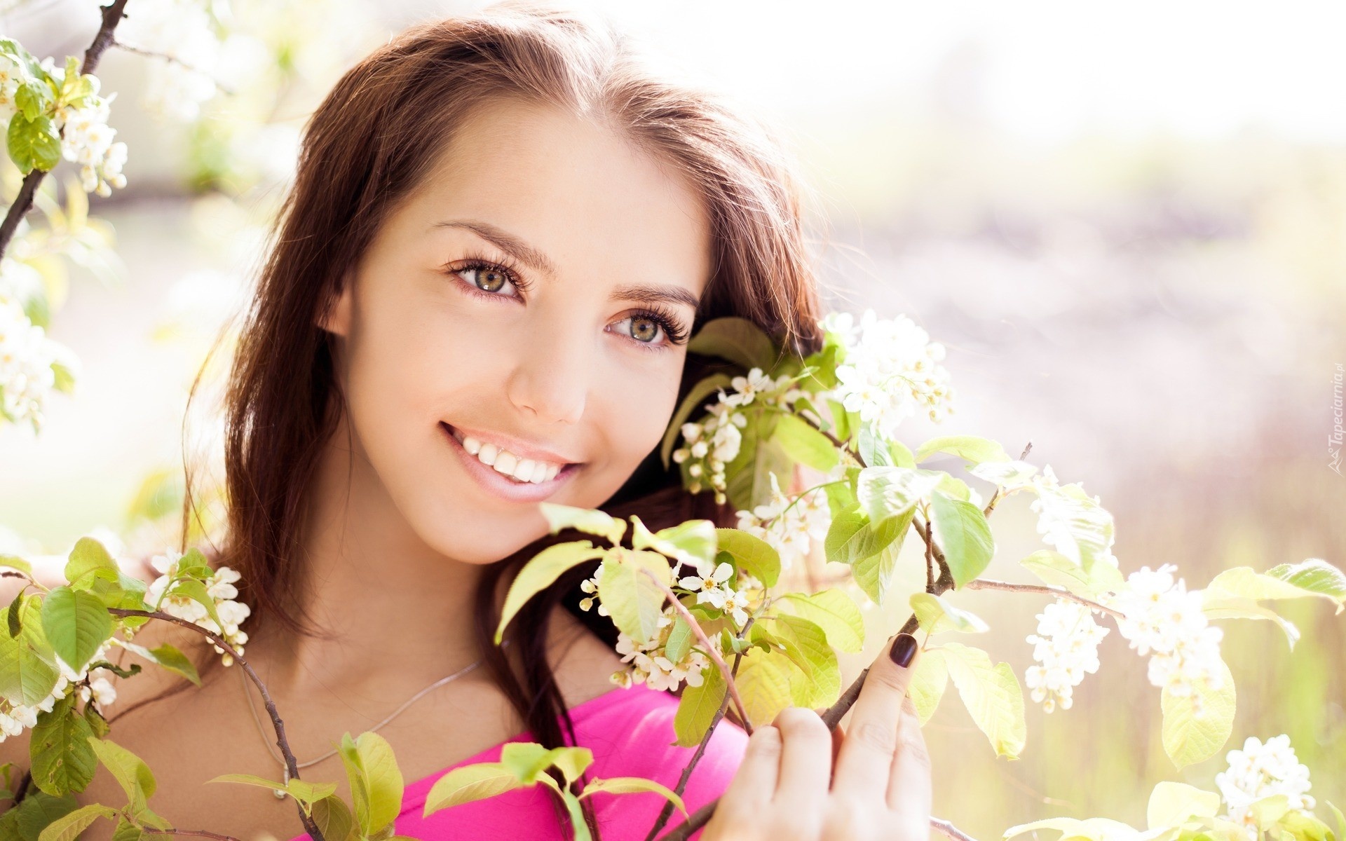 Edytor tapety: Uśmiechnięta, Kobieta, Kwitnące, Drzewo