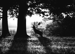 Edytor tapety: Świt, Drzewa, Jeleń