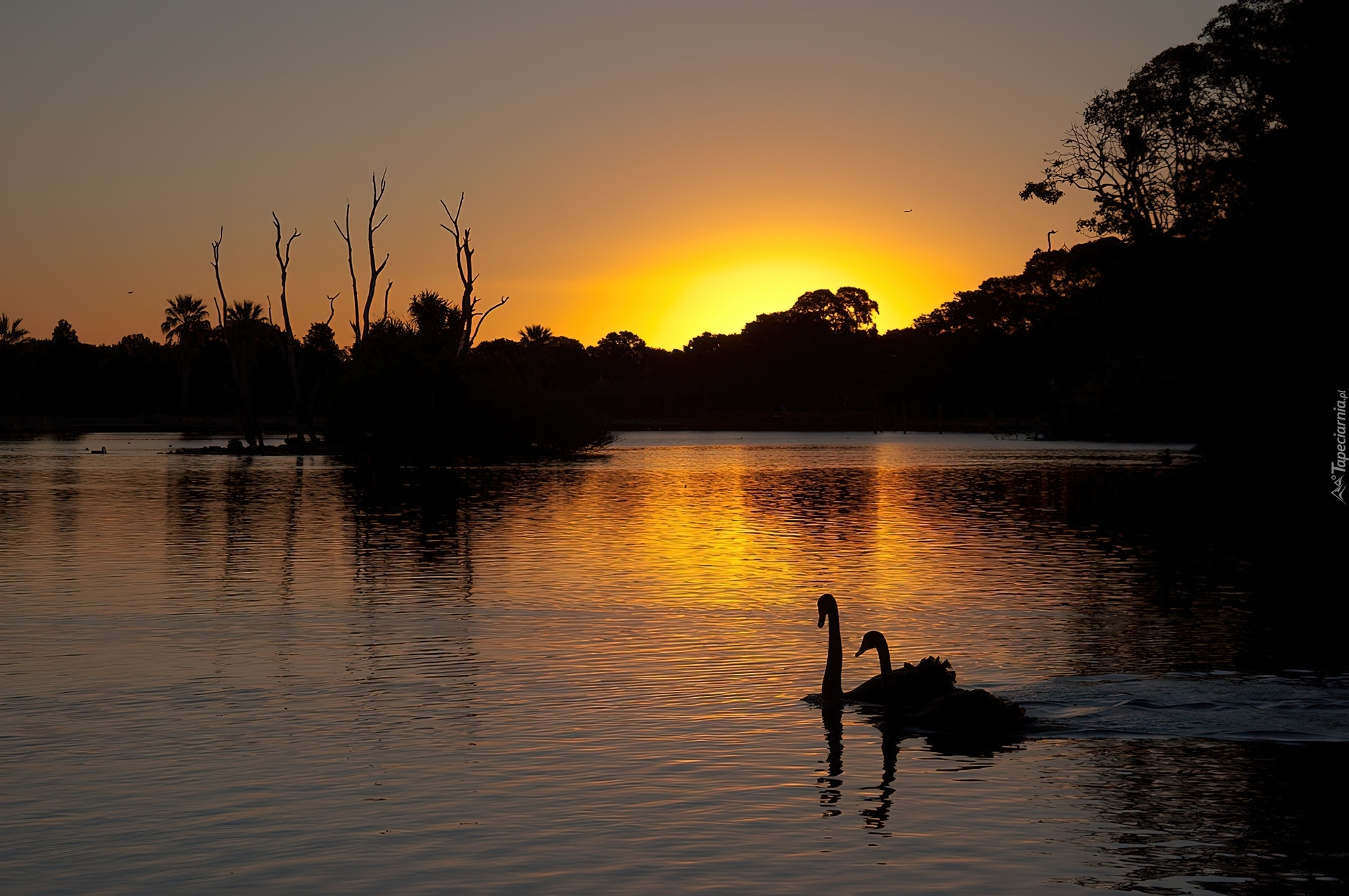 Edytor tapety: Jezioro, Zachód Słońca, Łabędzie