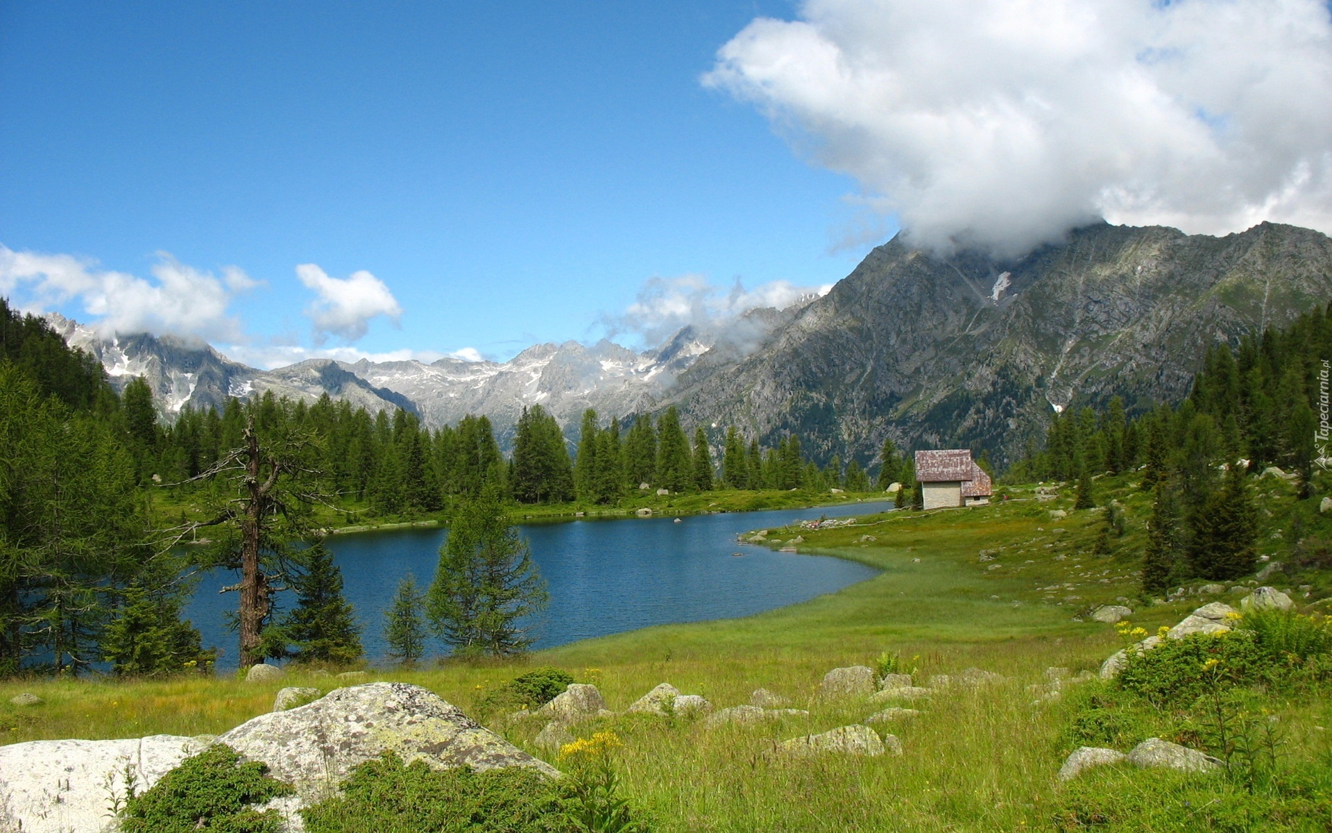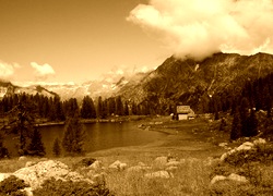 Edytor tapety: Rzeka, Góry, Lasy, Chmury, Domek