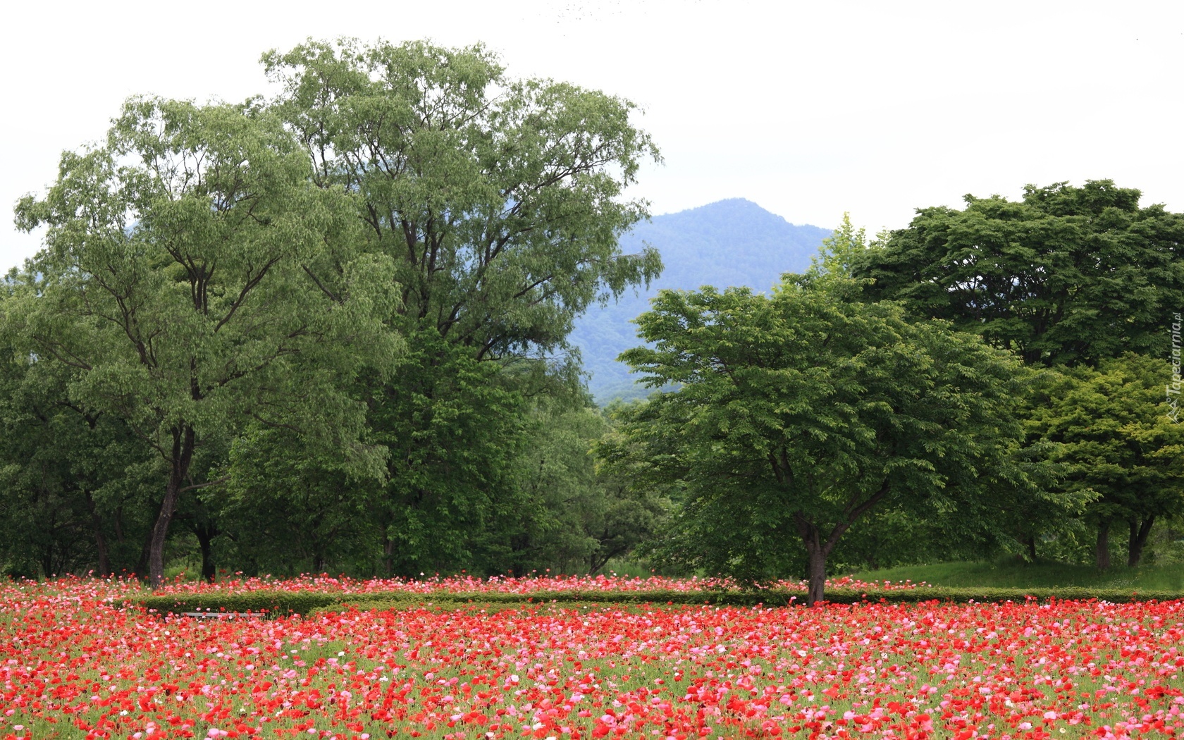 Edytor tapety: Łąka, Maki, Drzewa, Góry