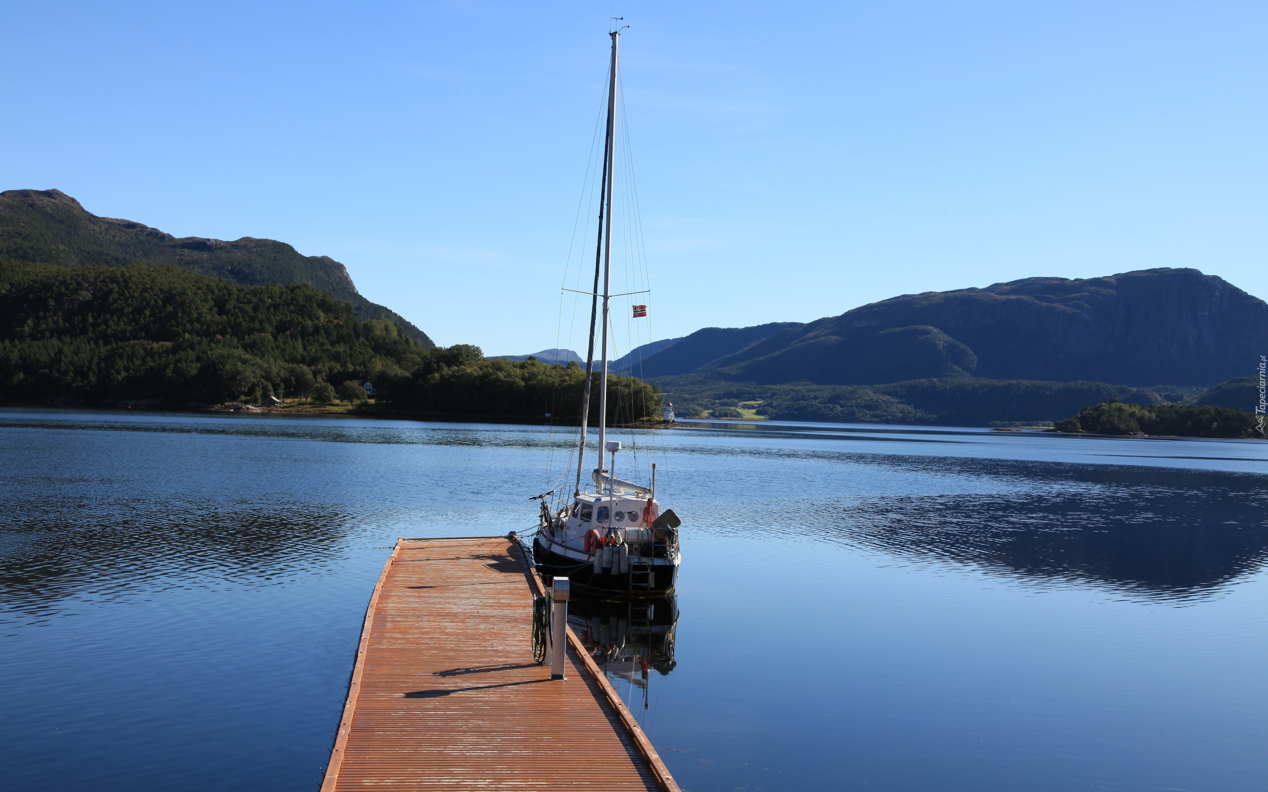 Edytor tapety: Jezioro, Żaglówka, Pomost, Góry