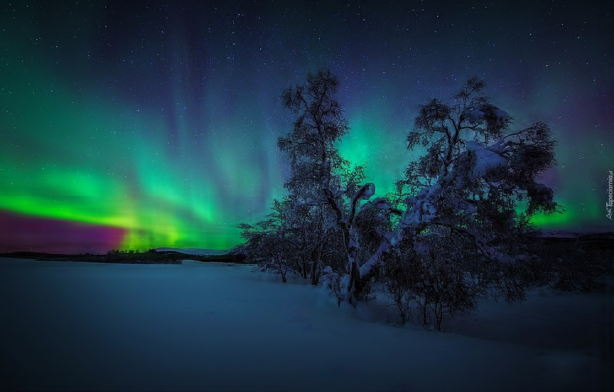 Edytor tapety: Zorza, Polarna, Drzewa, Zima