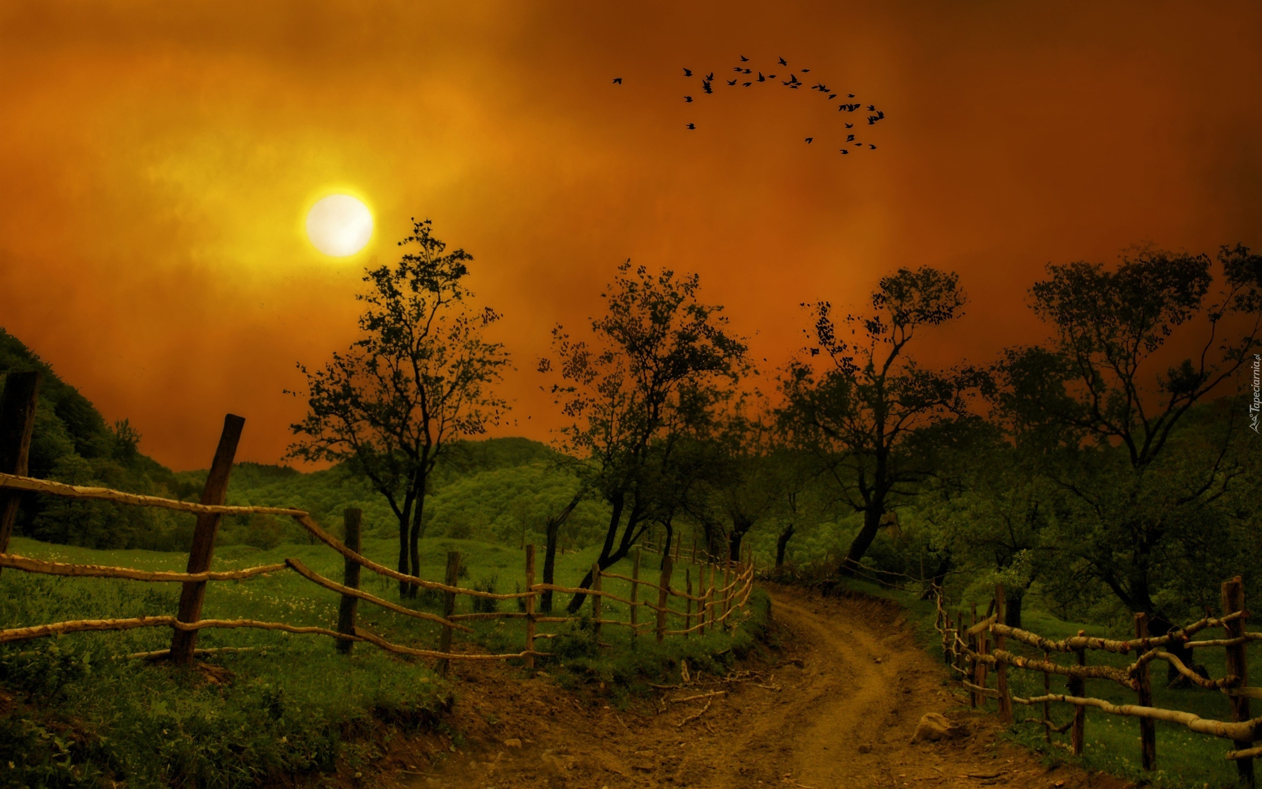 Edytor tapety: Zachód, Słońca, Góry, Drzewa, Droga, Ogrodzenie