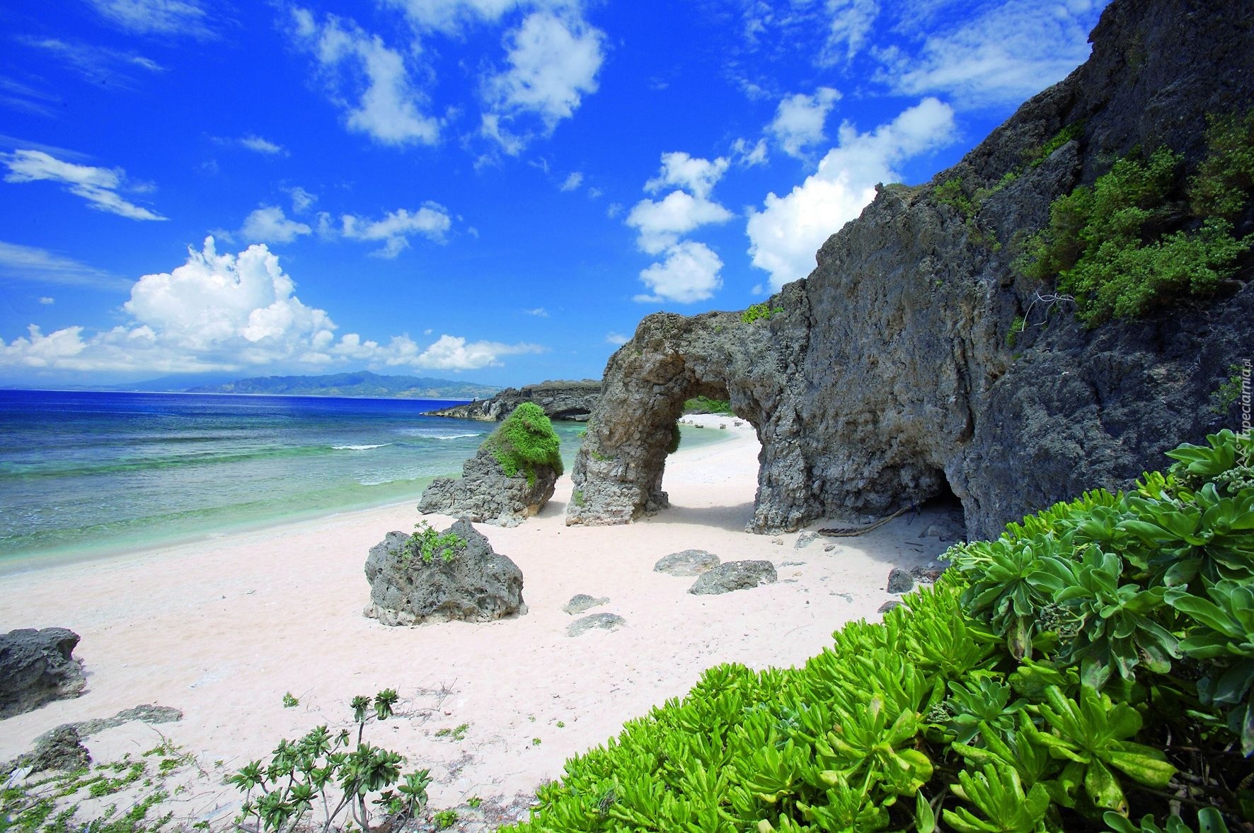 Edytor tapety: Plaża, Skały, Rośliny, Tropikalne, Morze, Niebo, Chmurki