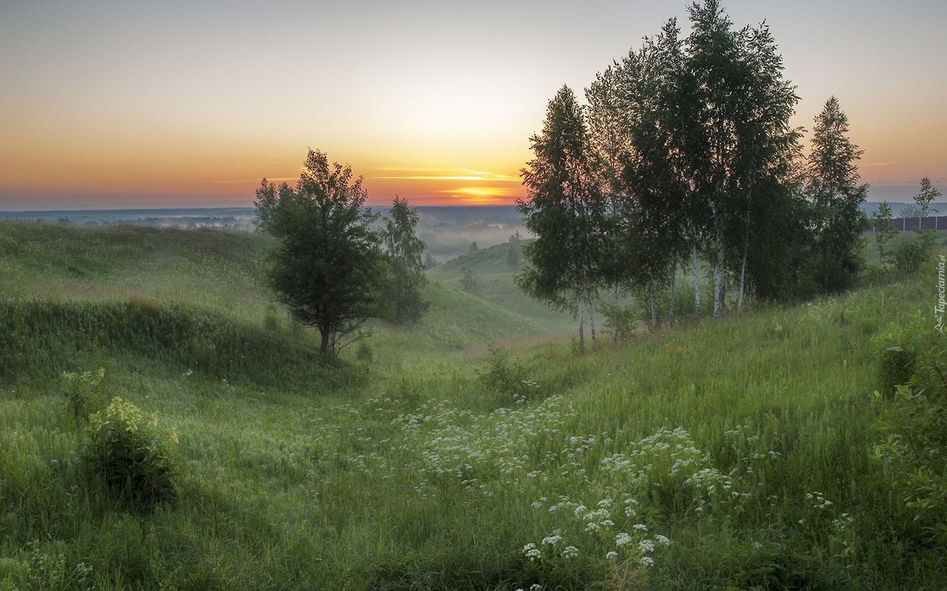 Edytor tapety: Łąki, Kwiaty, Drzewa, Zachód, Słońca