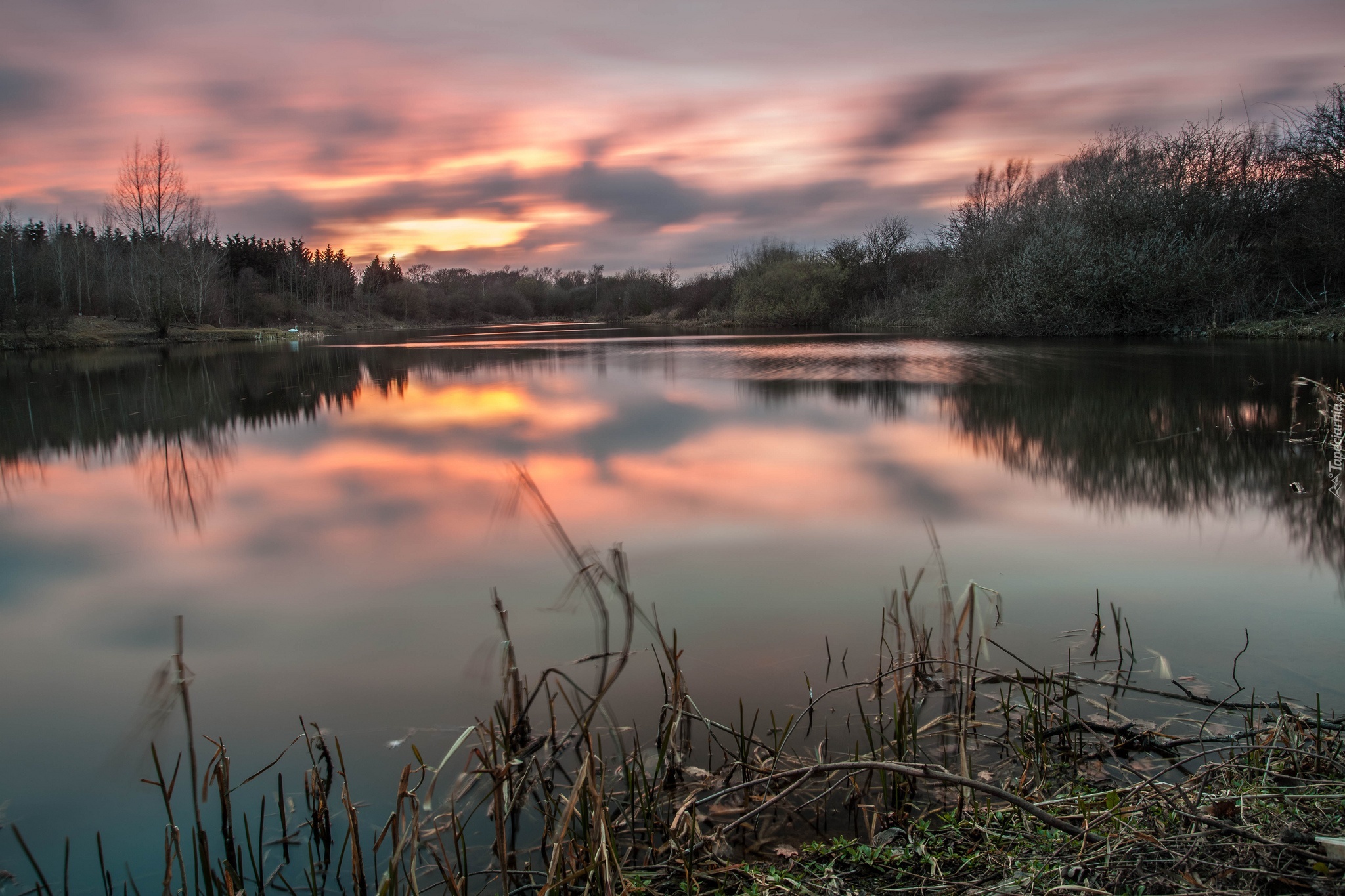 Edytor tapety: Jezioro, Drzewa, Trawy, Zachód, Słońca