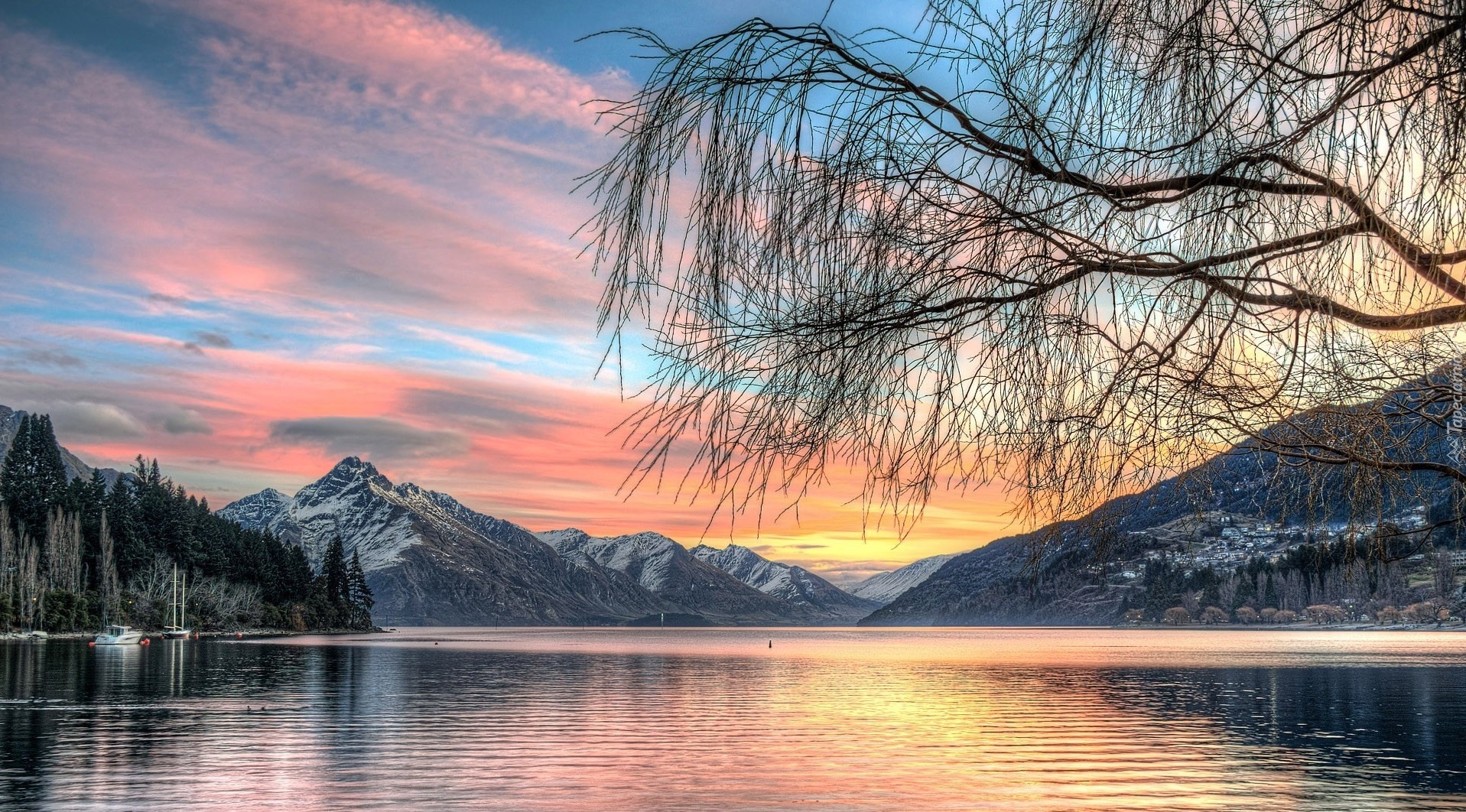 Edytor tapety: Góry, Jezioro, Zachód, Słońca, Drzewa