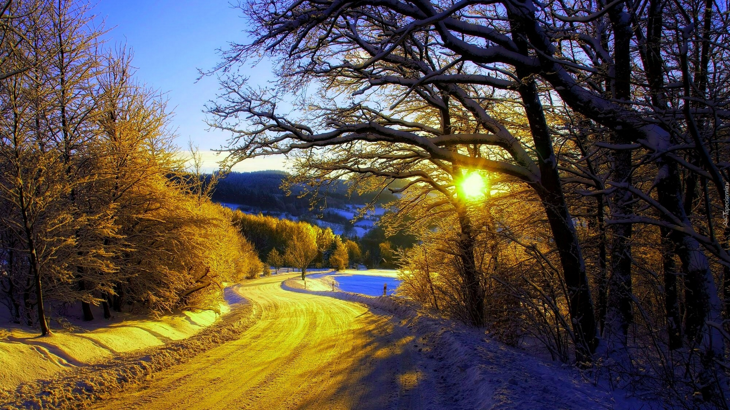 Edytor tapety: Droga, Drzewa, Słońce, Śnieg