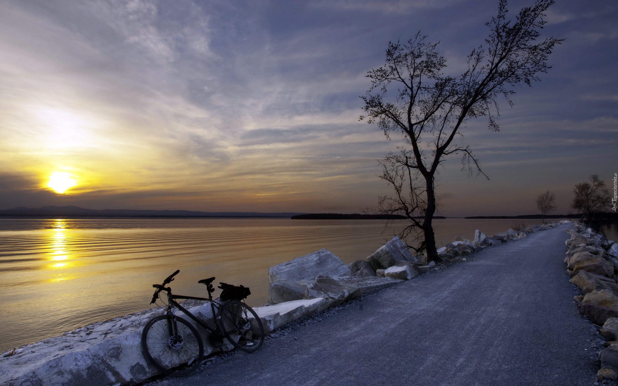 Edytor tapety: Droga, Jezioro, Zachód, Słońca, Rower