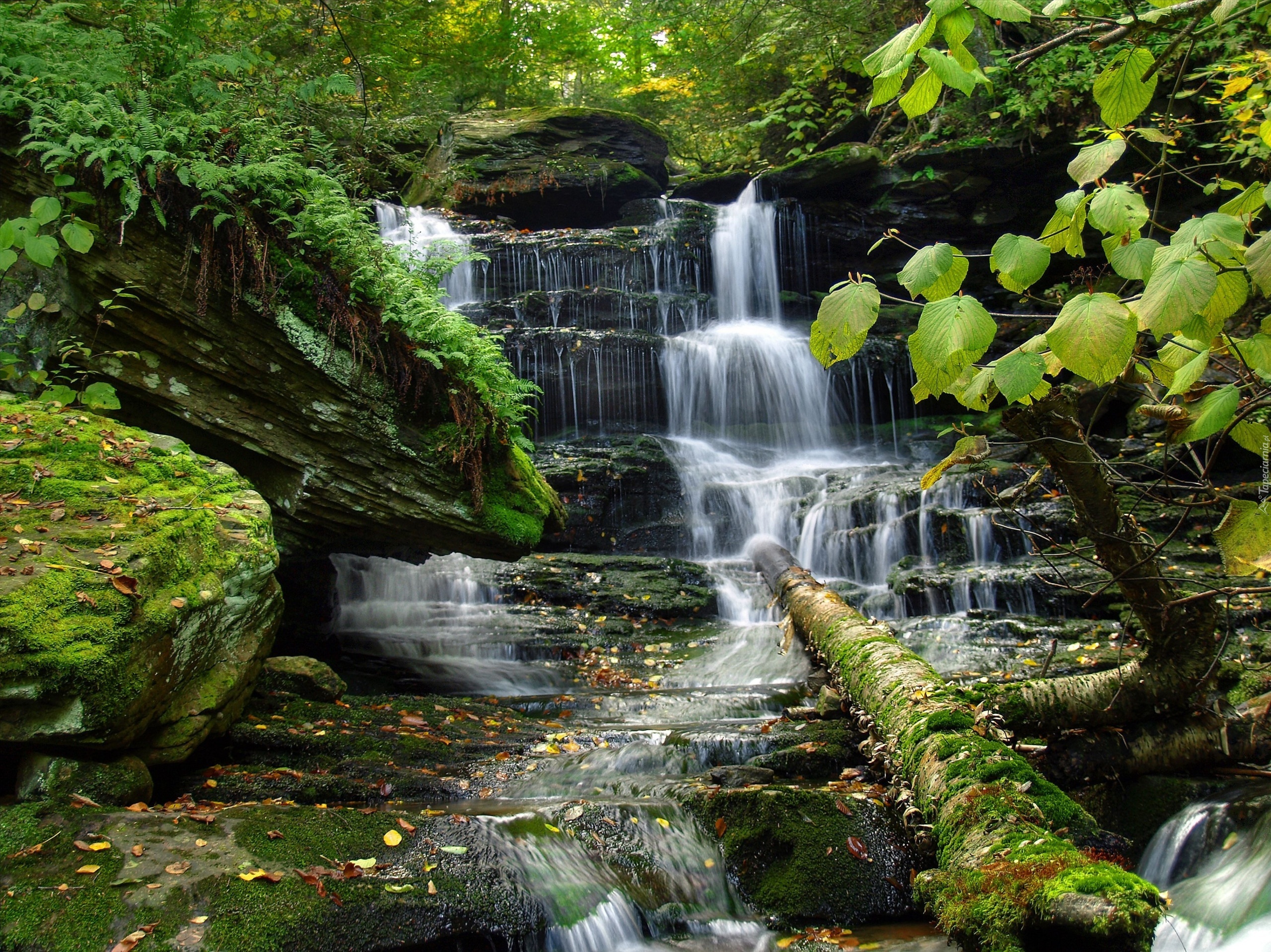 Edytor tapety: Las, Rzeczka, Wodospad, Drzewa, Krzewy