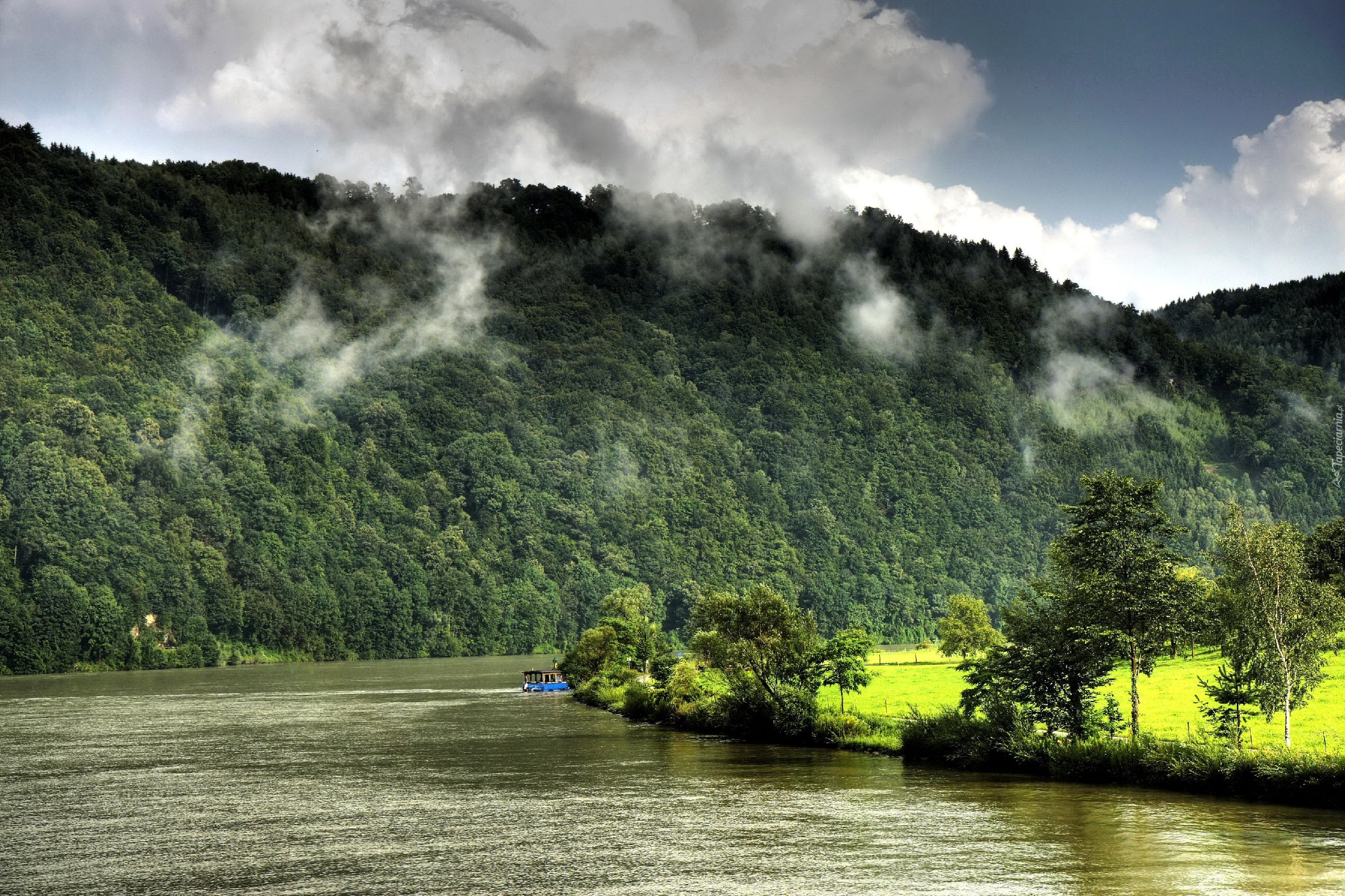Edytor tapety: Rzeka, Góry, Lasy, Łąka, Chmury