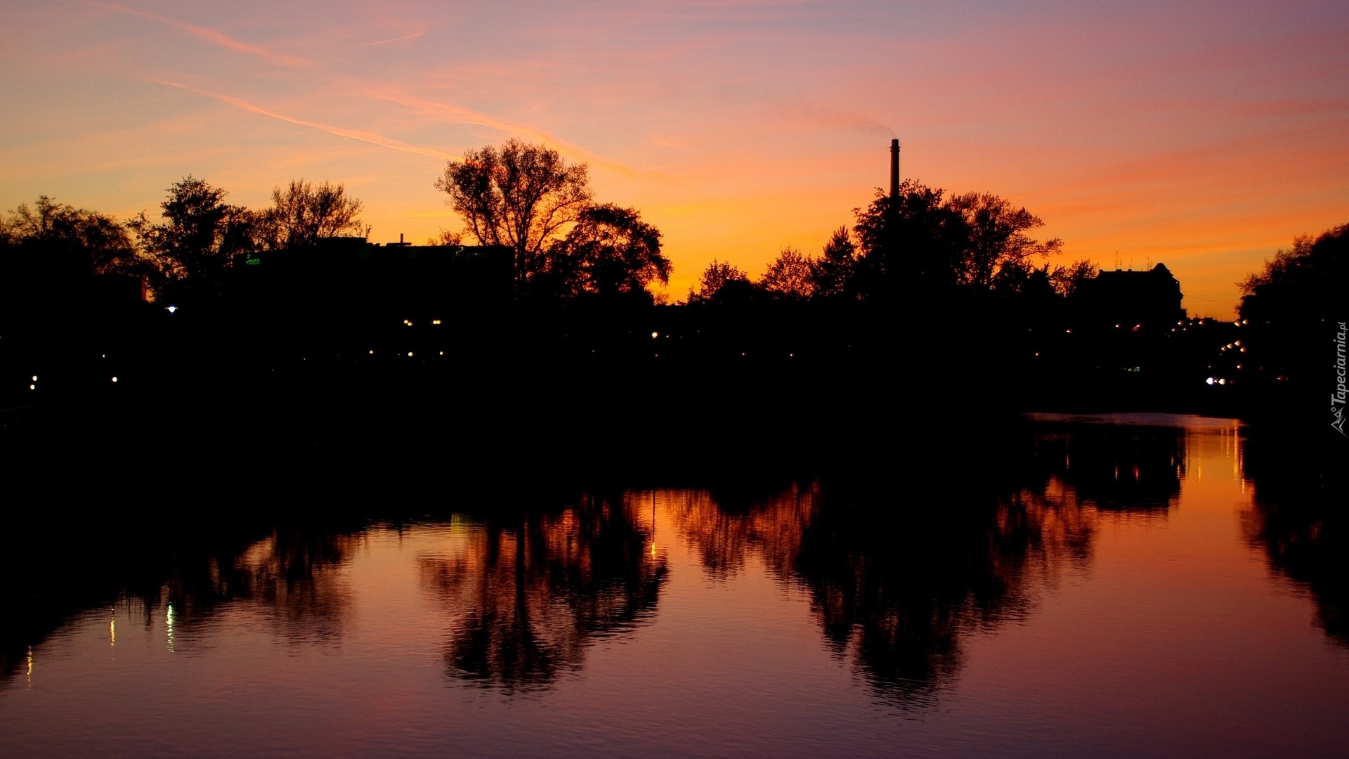 Edytor tapety: Zachód Słońca, Rzeka, Drzewa, Odbicie, Miasto, Wrocław