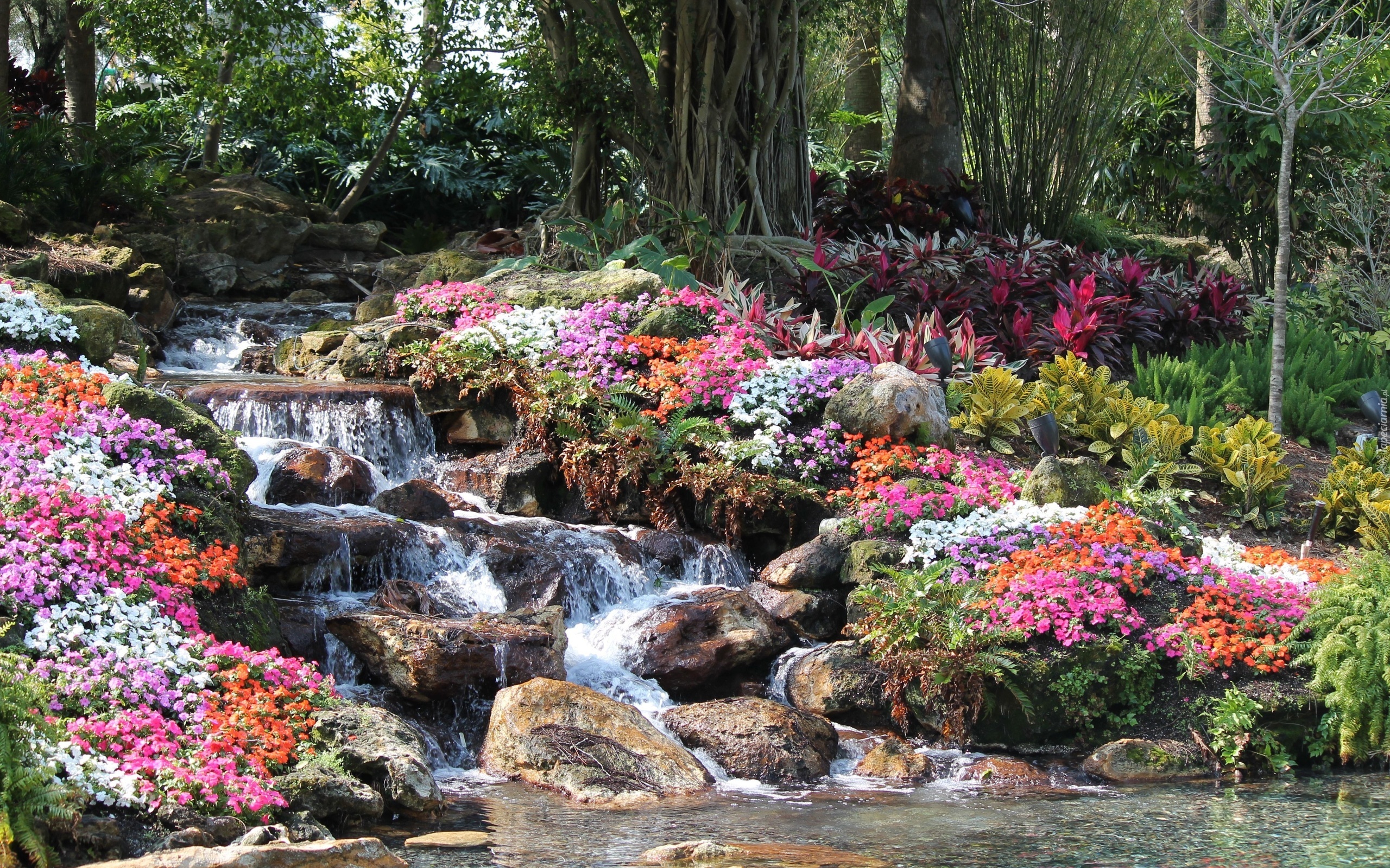 Edytor tapety: Wodospad, Las, Kwiaty, Kamienie