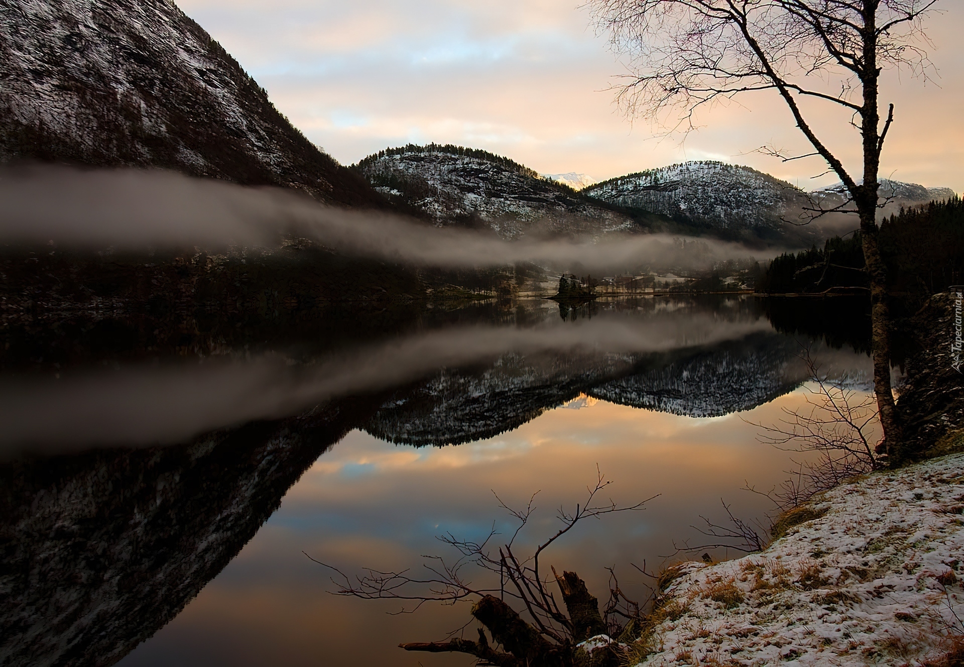 Edytor tapety: Jezioro, Góry, Mgła, Odbicie, Jolstravatnet, Norwegia