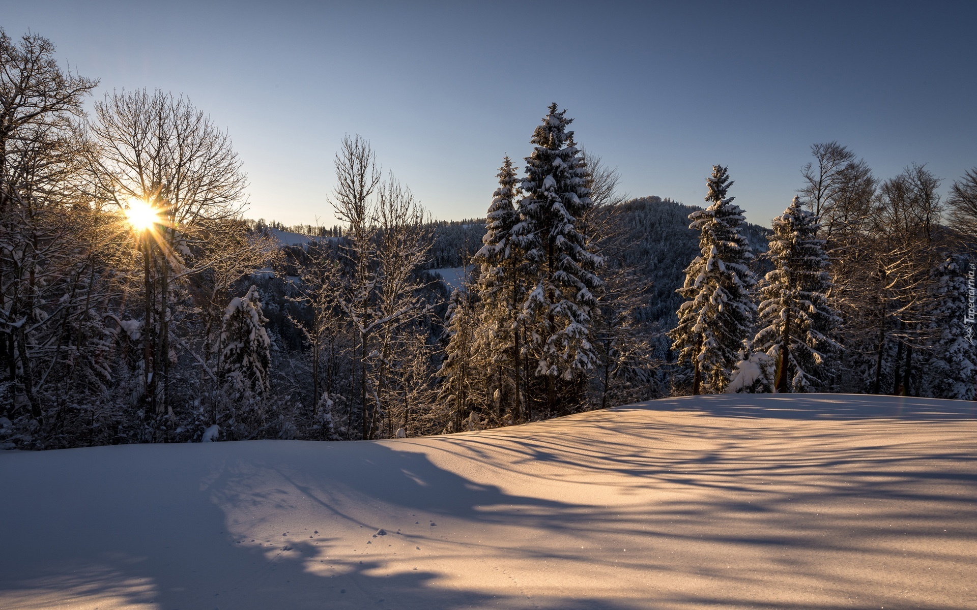 Edytor tapety: Zima, Drzewa, Promienie Słońca