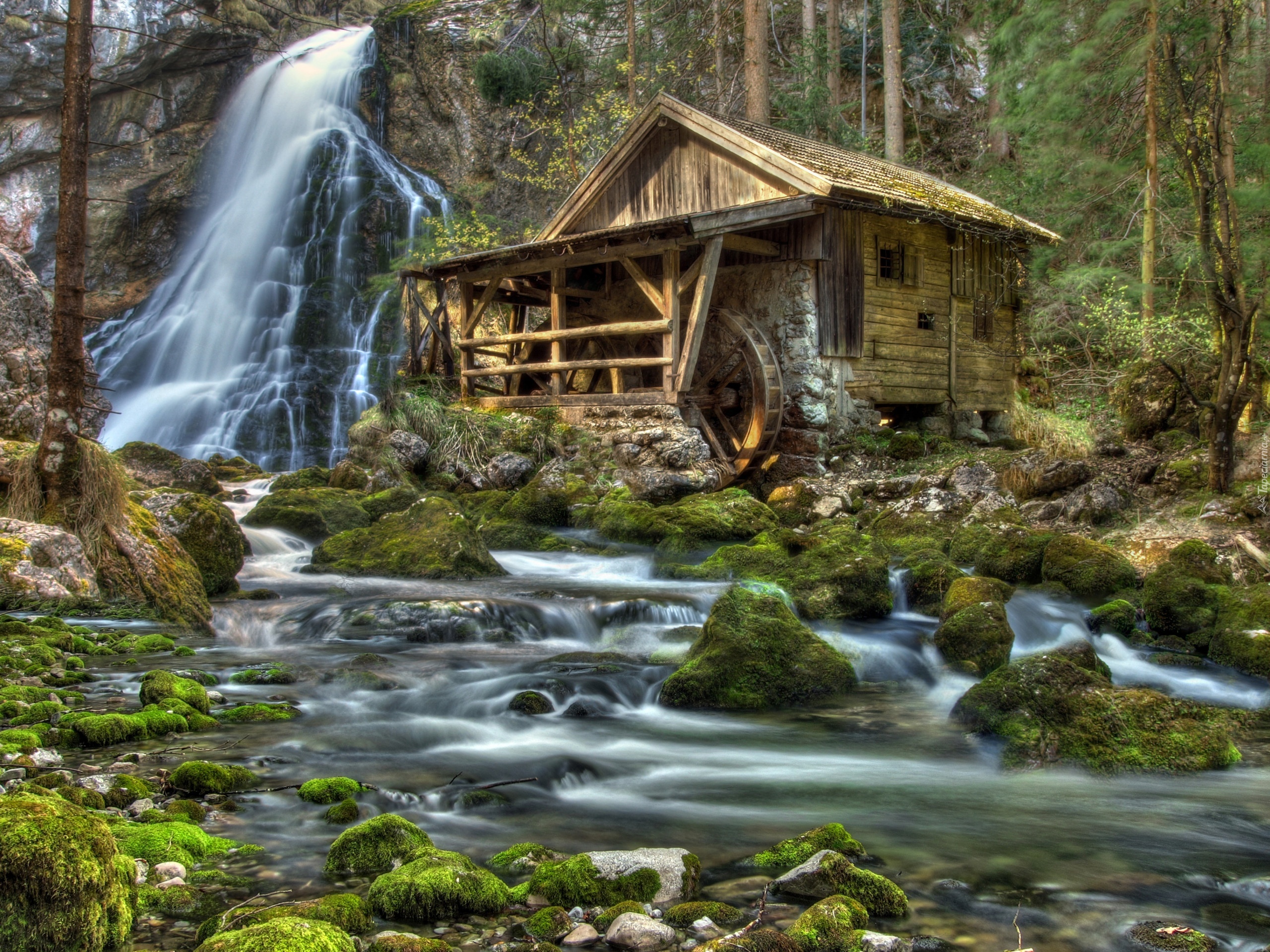 Edytor tapety: Wodospad, Rzeka, Kamienie, Młyn, Las
