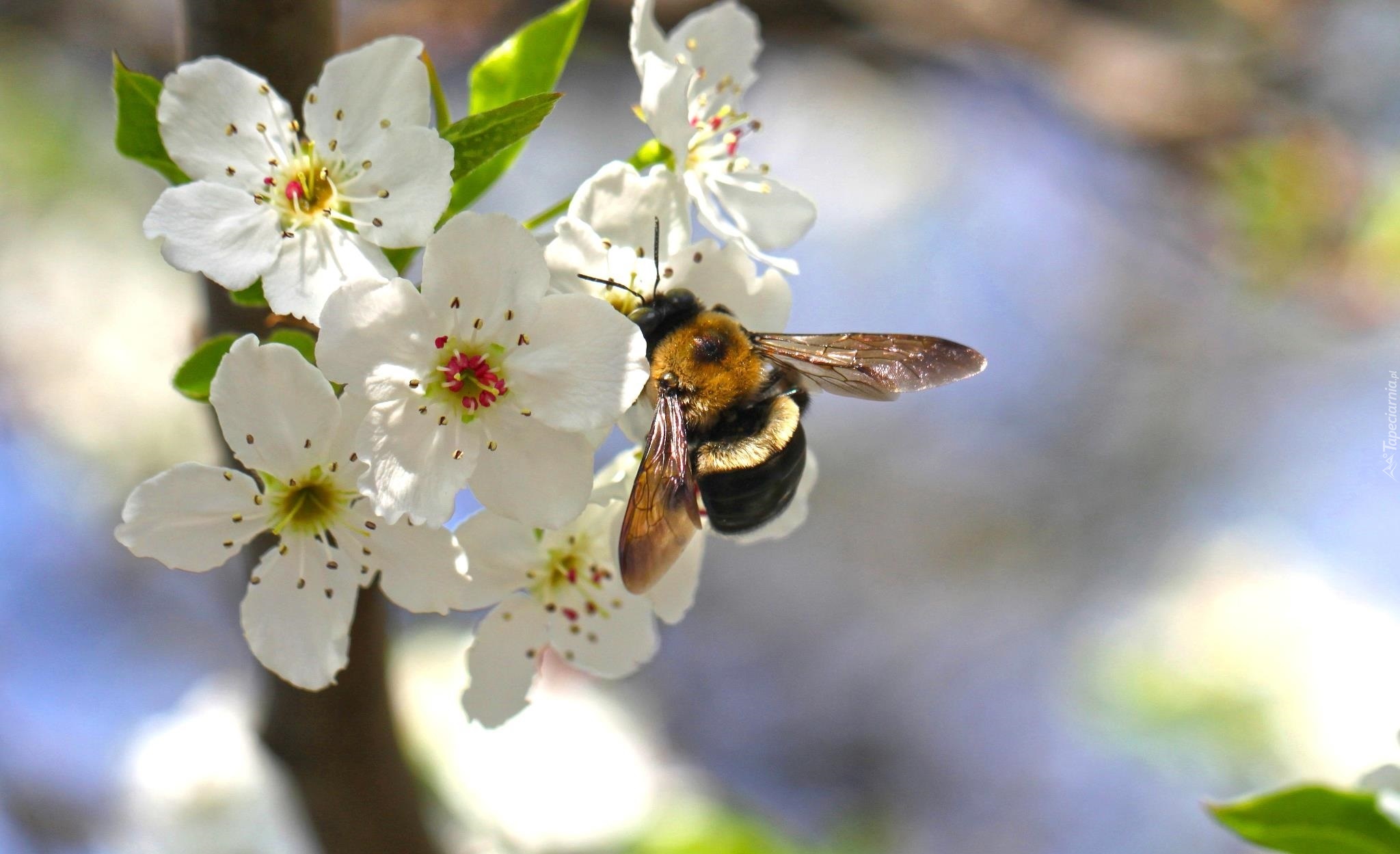 Edytor tapety: Białe, Kwiaty, Wiśni, Pszczoła