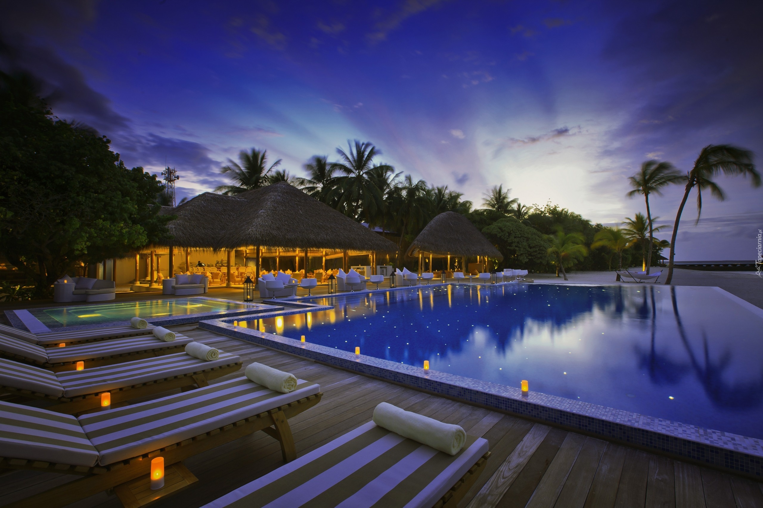 Edytor tapety: Malediwy, Restauracja, Basen, Leżaki, Palmy, Wakacje