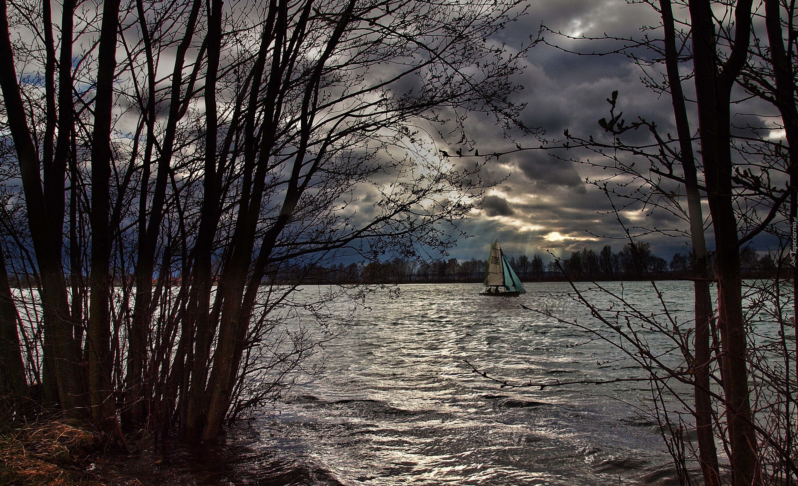 Edytor tapety: Chmury, Jezioro, Drzewa, Żaglówka