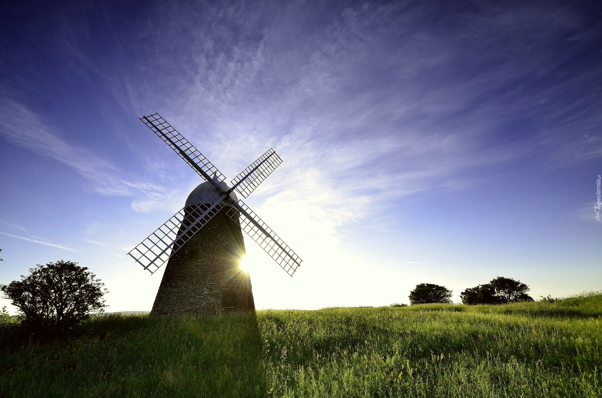 Edytor tapety: Wschód, Słońca, Łąka, Wiatrak