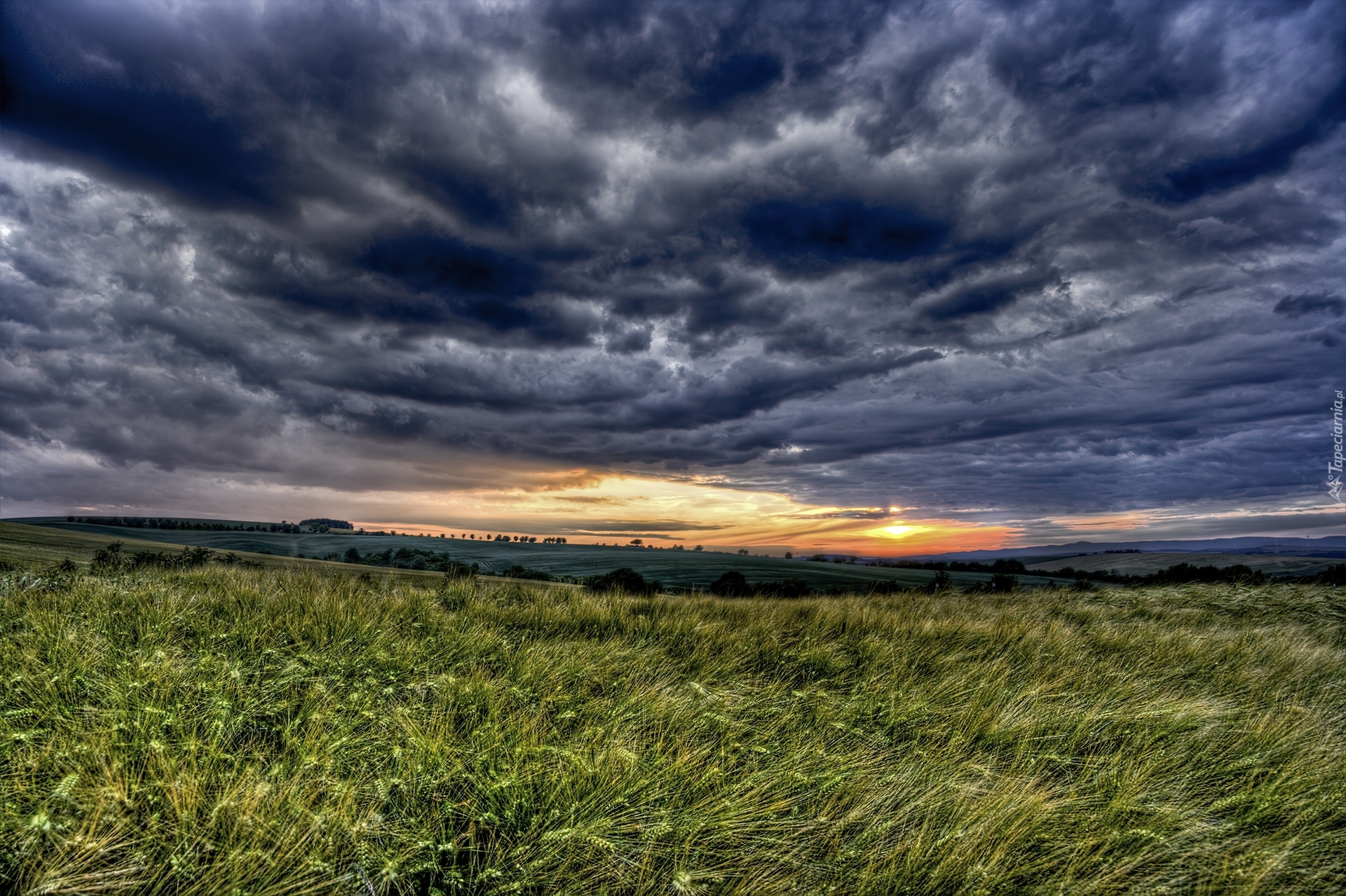Edytor tapety: Zachód, Słońca, Chmury, Trawy