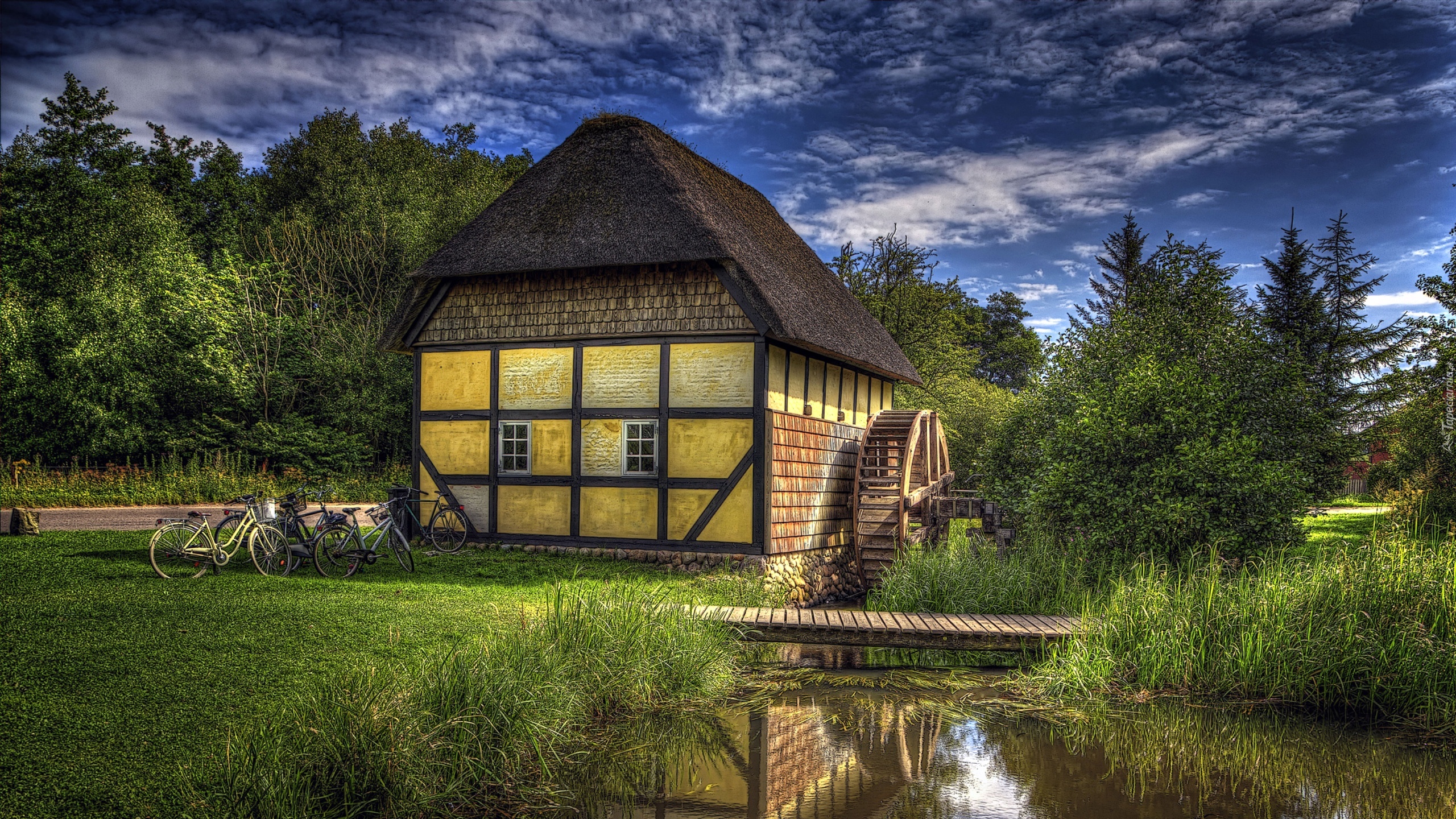 Edytor tapety: Las, Strumyk, Kładka, Młyn Wodny, Rowery