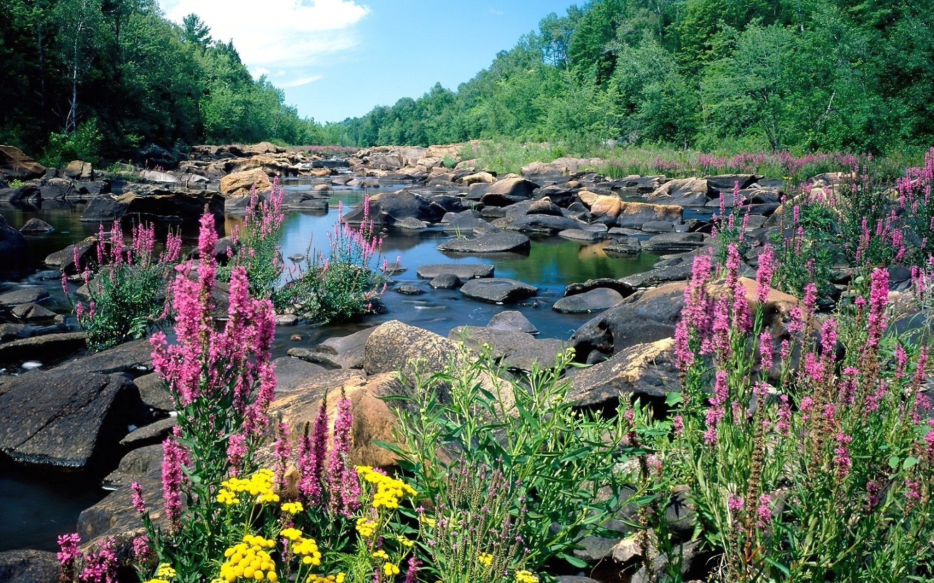 Edytor tapety: Kamienista, Rzeka, Las, Kwiatki
