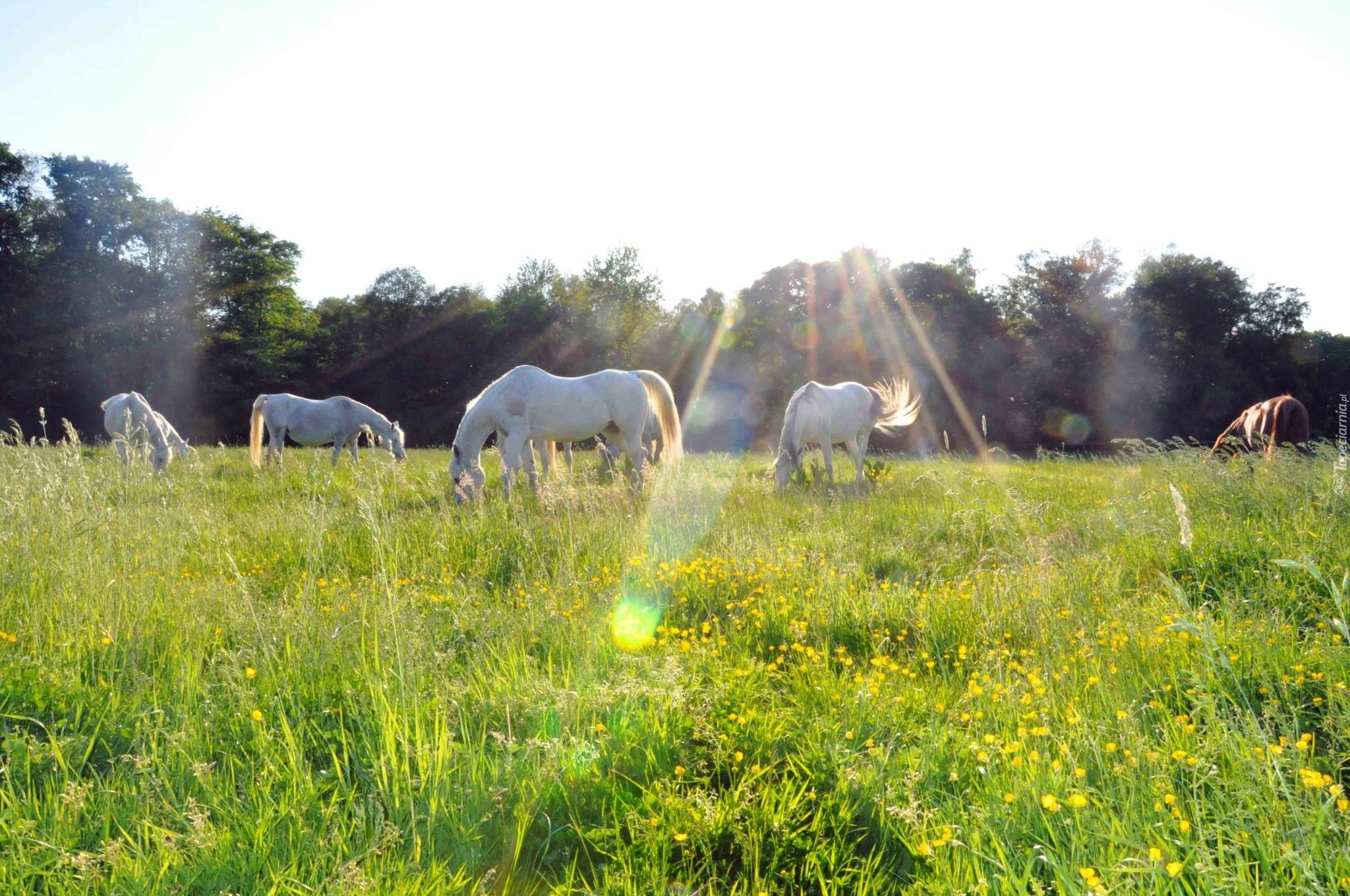 Edytor tapety: Konie, Łąka, Promienie, Słońca