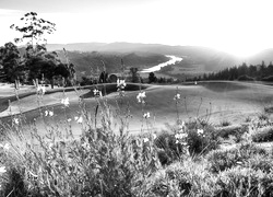 Edytor tapety: Zachód, Słońca, Góry, Rzeka, Polne, Kwiaty