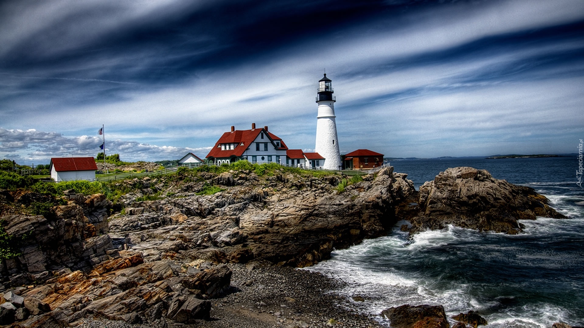 Edytor tapety: Morze, Skały, Domy, Latarnia, Morska, Na Wybrzeżu