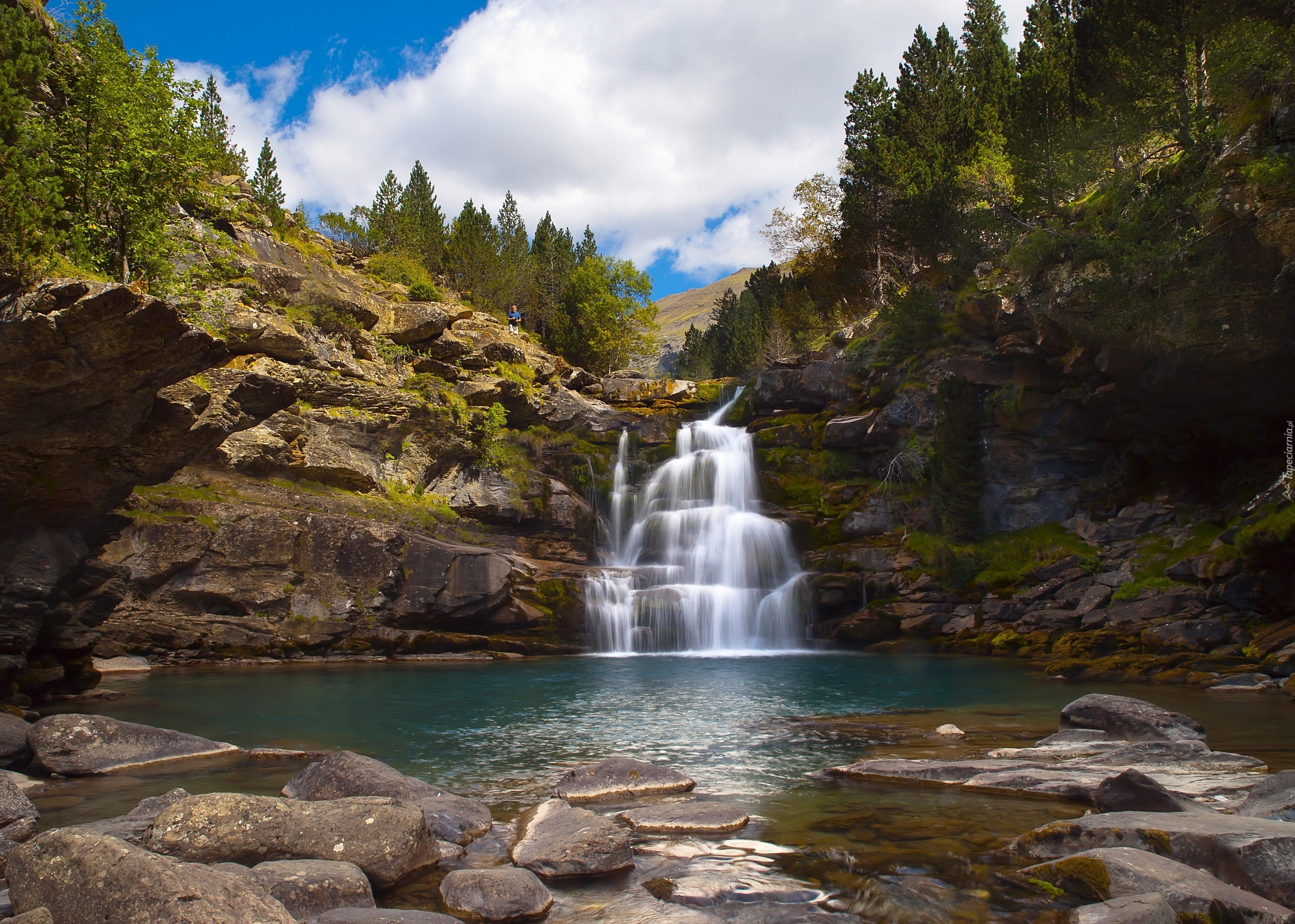 Edytor tapety: Wodospad, Kamienie, Las, Chmury
